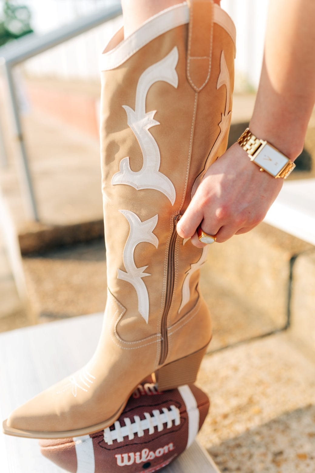 Step into timeless Western elegance with The Adriana Camel Western Boot. These stunning knee-high boots feature a sophisticated camel and white design with a pointed toe that elongates your silhouette. The convenient zip-up closure ensures easy on-off while maintaining that authentic cowgirl aesthetic. Perfect for adding a touch of country charm to any outfit, these boots are designed for the fashion-forward woman who appreciates both style and functionality.