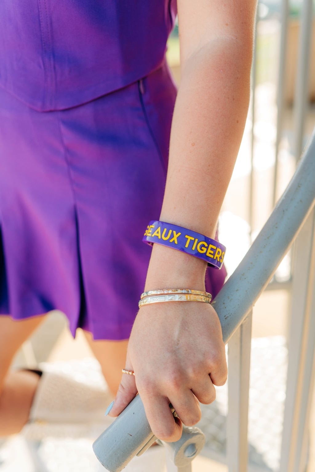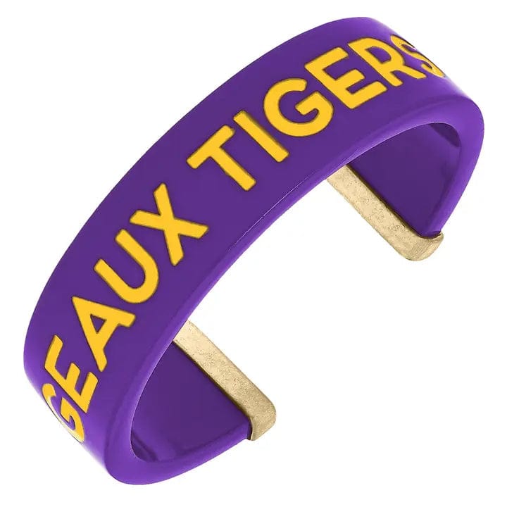 Get ready for game day with the LSU Tigers Resin Cuff Bracelet in Purple! This stylish cuff features the famous "Geaux Tigers" phrase. Wear alone or build a stack!