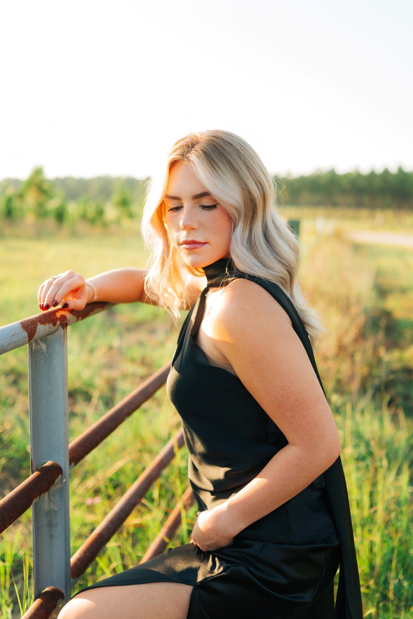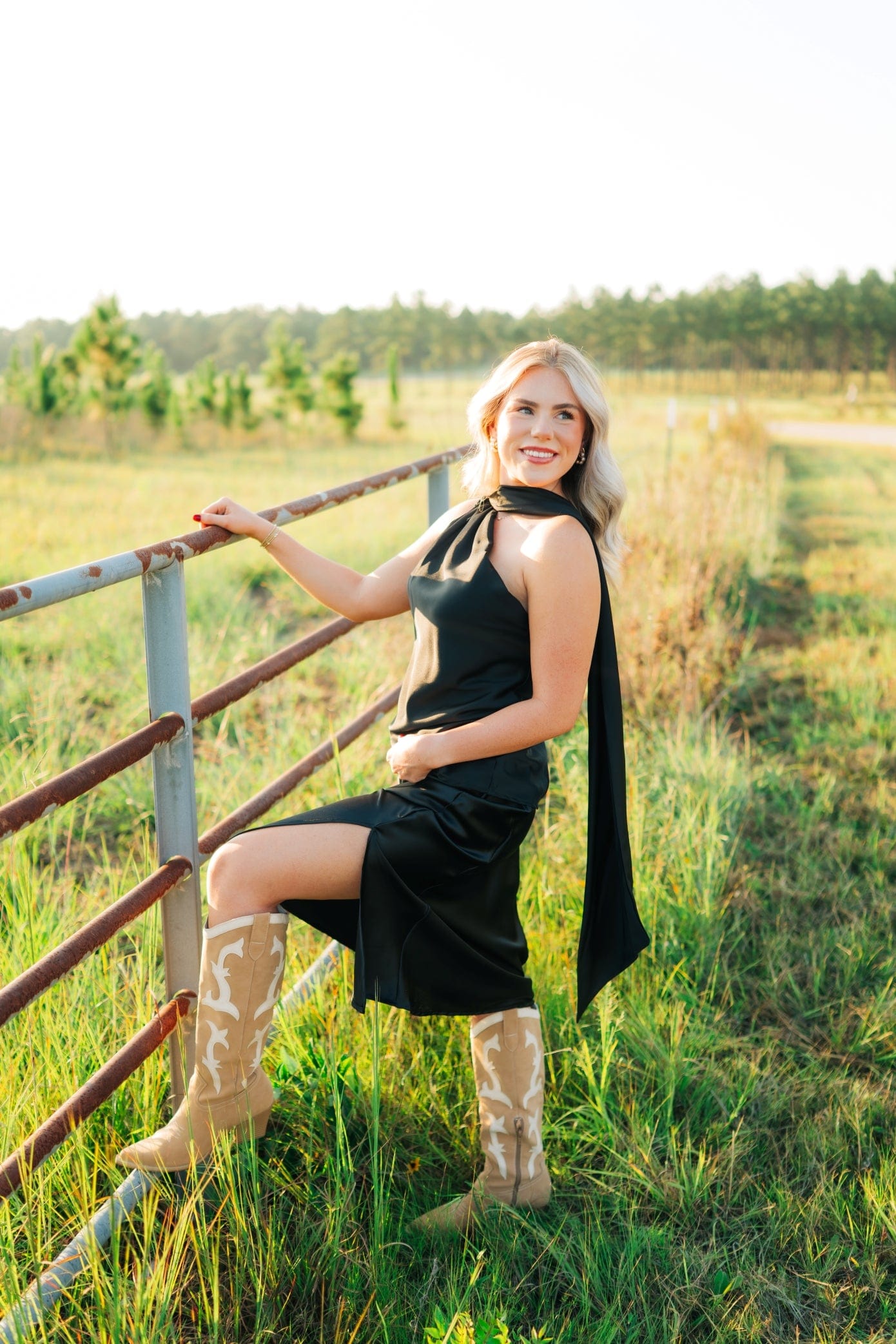 Elevate your wardrobe with this black satin one-shoulder top featuring a flowing, sleeveless design and an elegant scarf detail. Its sleek satin fabric offers a luxurious feel, while the asymmetric silhouette adds a trendy, sophisticated touch. Perfect for both classy events and stylish evenings out, this top blends comfort and fashion effortlessly.
