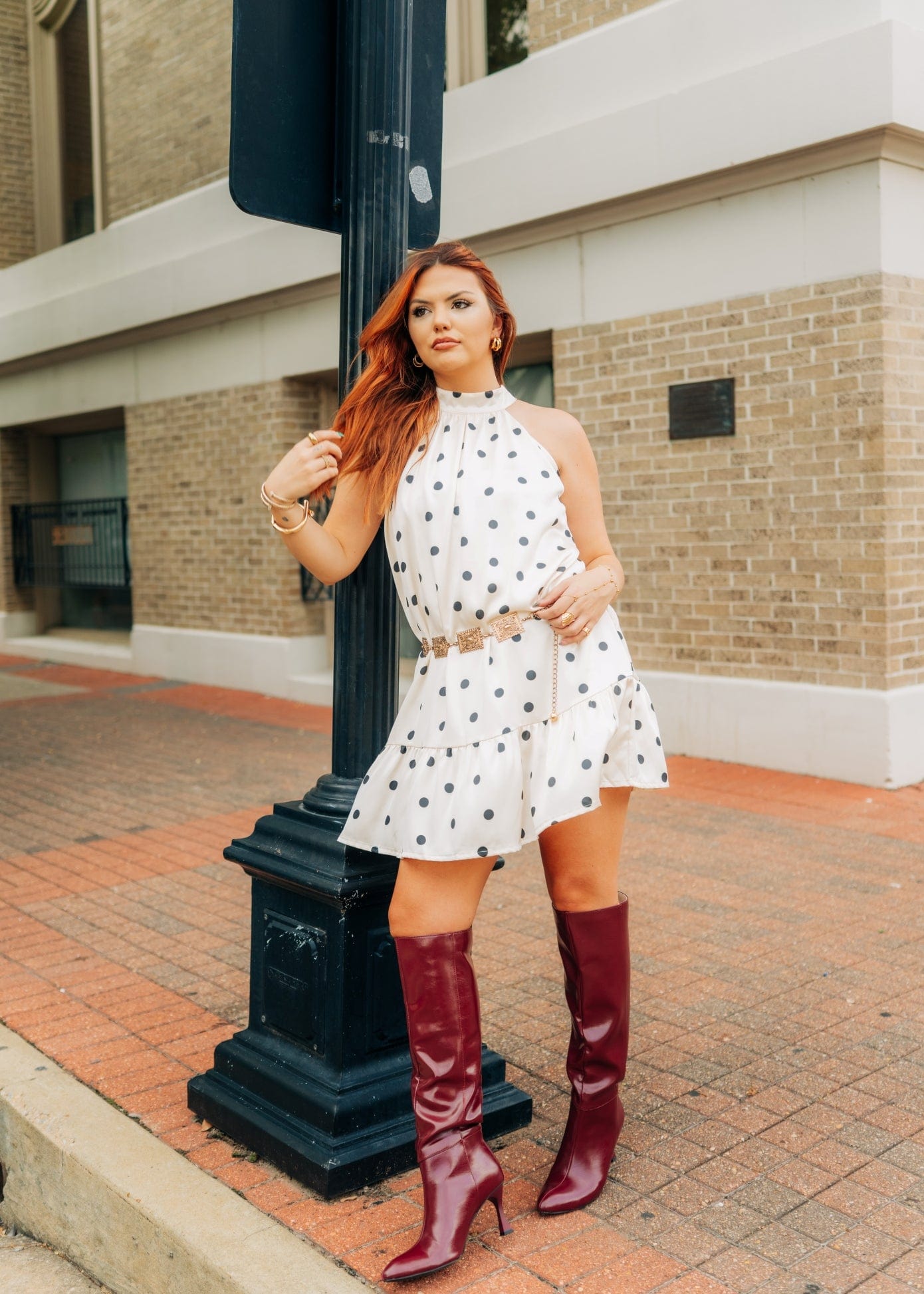 This cream mini dress features timeless black polka dots and a flattering halter neckline that highlights your shoulders. Crafted from smooth satin, it offers a flowy silhouette lined for comfort and ease. Perfect for warm days or special occasions, its sleeveless design keeps you cool while adding an elegant, playful touch to your wardrobe.
