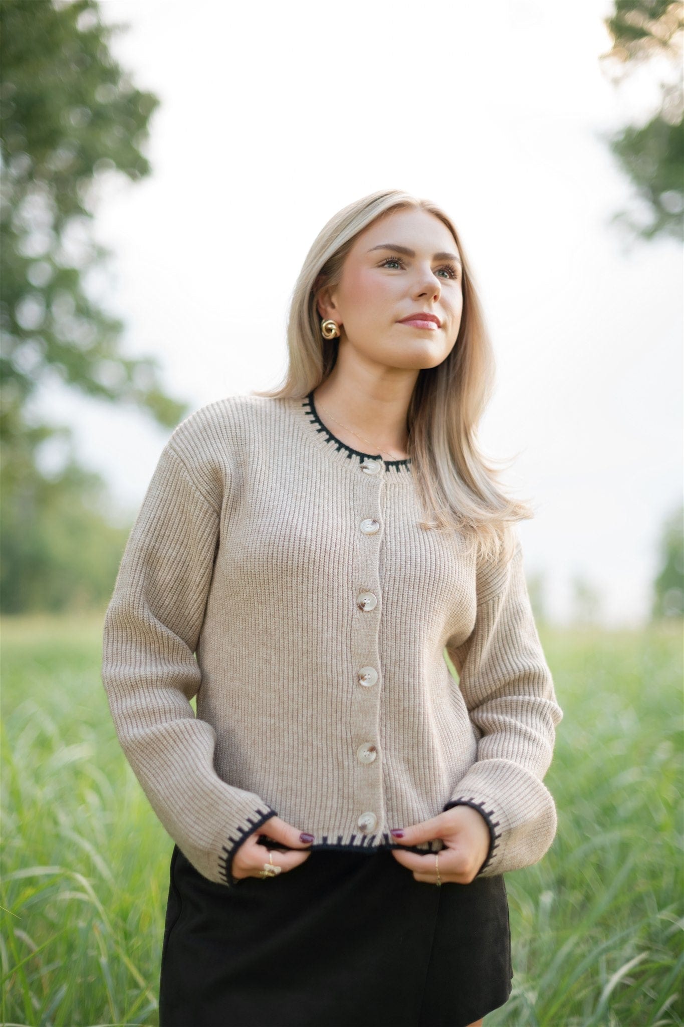 Elevate your fall wardrobe with this taupe cardigan sweater featuring chic black trim details. Its button-up design and long bell sleeves create a flattering, flowy silhouette that's perfect for layering. Crafted from soft knit fabric, it offers cozy comfort while keeping you stylish during cooler days. This versatile piece seamlessly blends sophistication with ease, making it an essential addition to your seasonal collection.