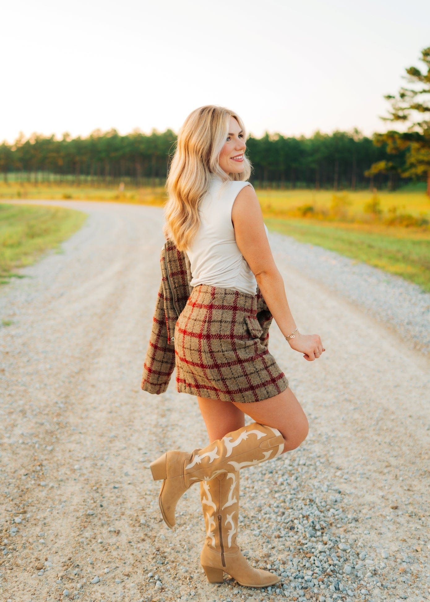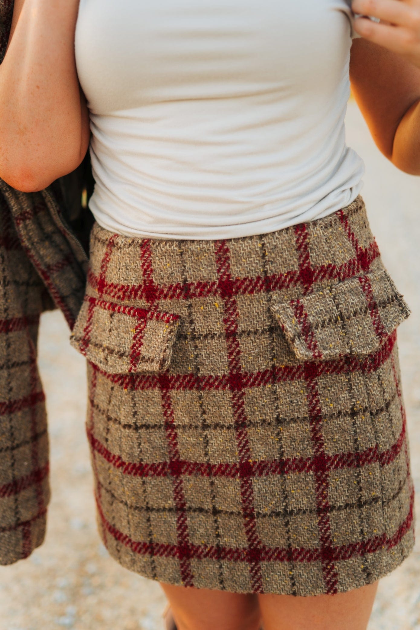 Elevate your fall wardrobe with this taupe plaid wool mini skirt, designed to hug your waist and showcase your silhouette. Its high-waisted, fitted cut offers a flattering, timeless look that pairs effortlessly with cozy knits or crisp blouses. Perfect for layering, it pairs beautifully with the matching jacket sold separately, making it easy to create a chic, coordinated outfit that transitions seamlessly from day to night. Stay stylish and warm this season with a skirt that embodies classic elegance and modern appeal.