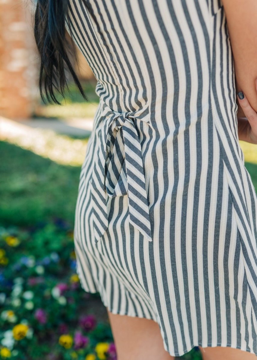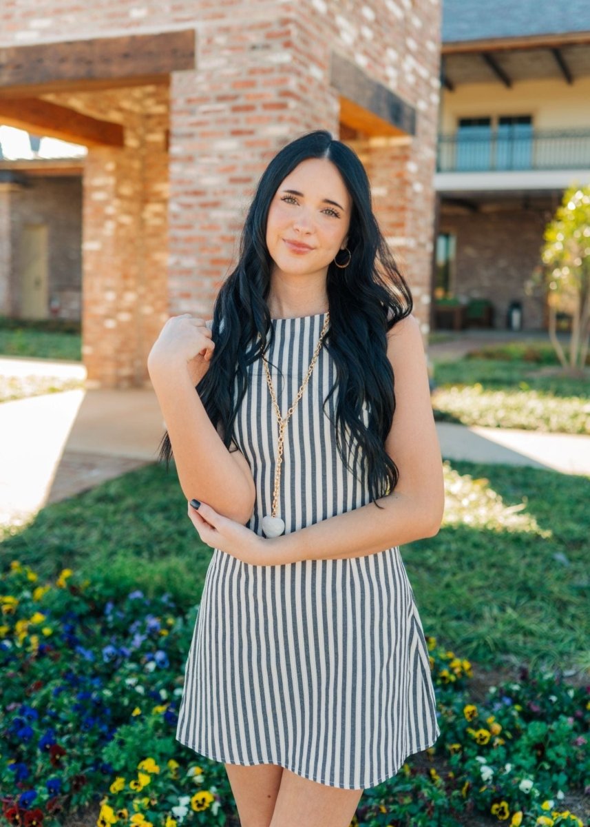 Effortless elegance meets flattering design in this cream and black striped mini dress. The classic boat neckline frames the shoulders beautifully, while the sleeveless cut keeps things light and breezy—perfect for warm-weather styling. A functional back zip closure and adjustable tie detail at the back create a custom fit that enhances your silhouette. Lightweight and versatile, this piece transitions seamlessly from casual daytime looks to evening occasions with minimal effort.