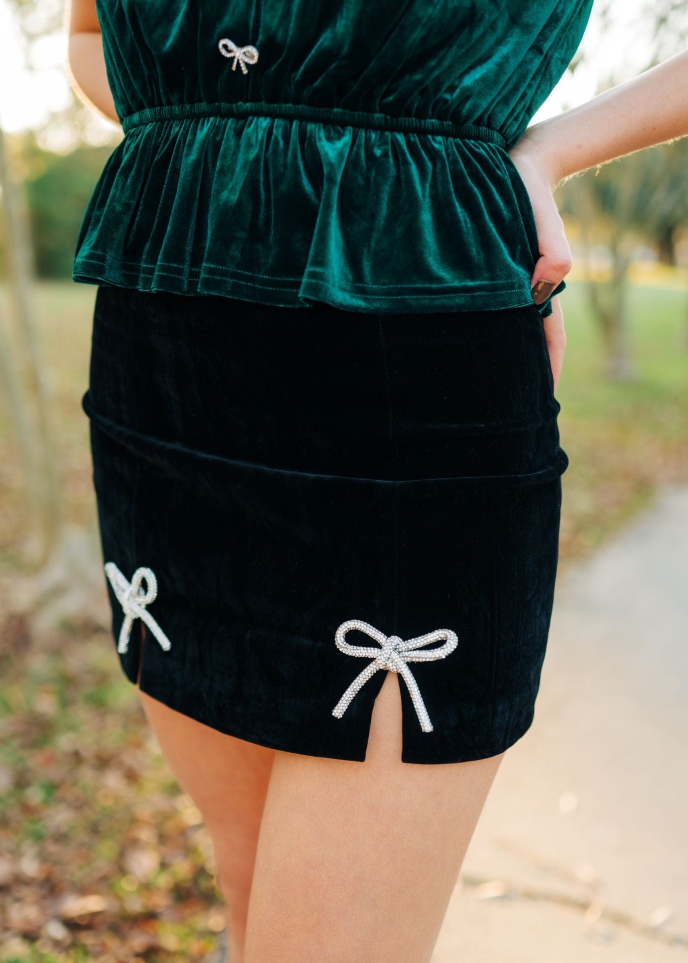 Elevate your holiday style with this black velvet mini skirt, designed to hug your curves with a flattering, high-waisted fit. The stretchy fabric ensures comfort all night, while the sparkling rhinestone bow detail adds a festive, eye-catching touch perfect for Christmas celebrations. Make every holiday moment unforgettable in this chic and sophisticated skirt.