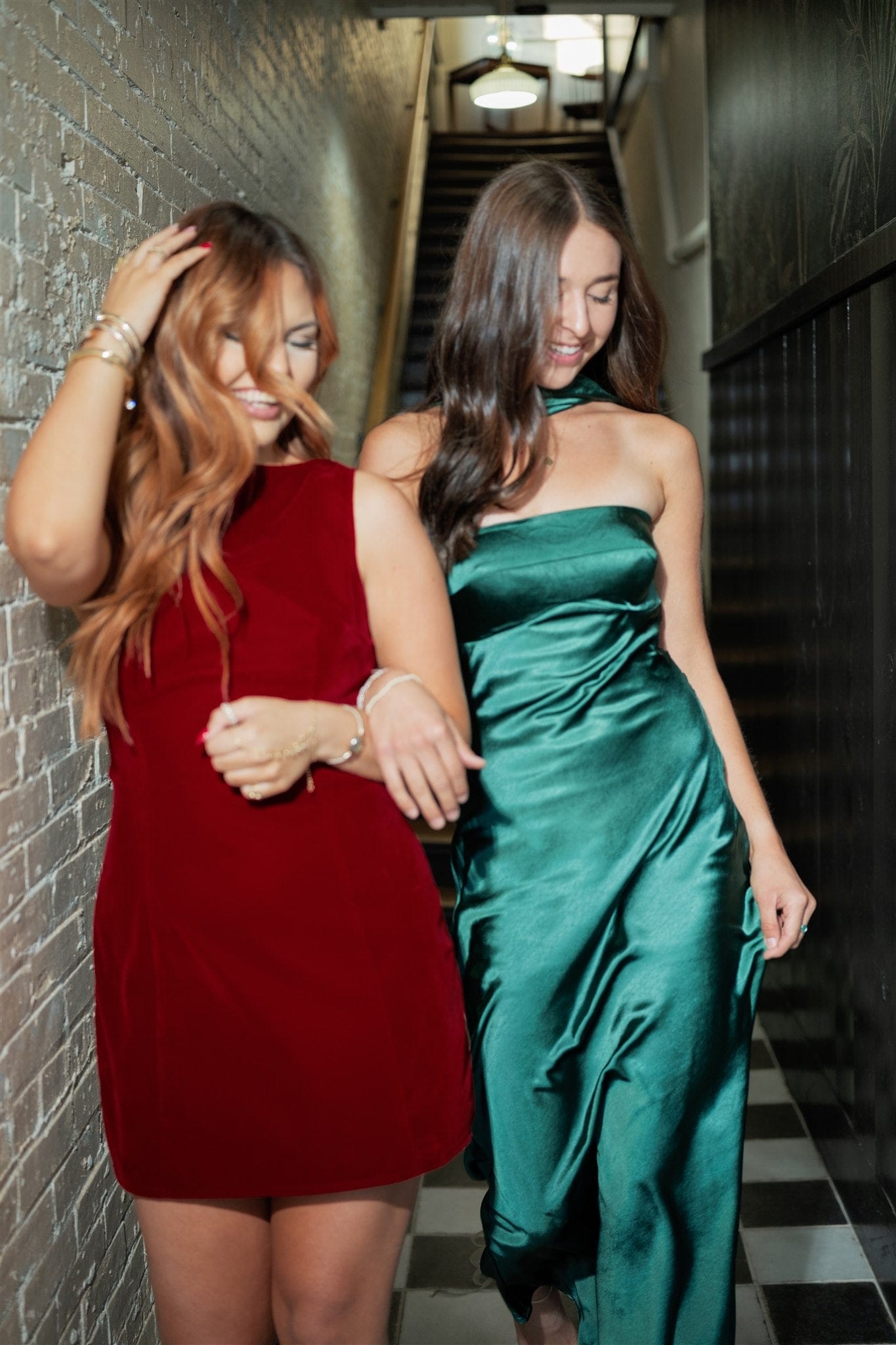 Elevate your holiday wardrobe with this stunning Carmine Red Velvet Mini Dress—a timeless piece that effortlessly transitions from festive gatherings to elegant evening events. The luxurious velvet fabric drapes beautifully in a flattering fit-and-flare silhouette, while the sleeveless design with a classic boat neckline offers refined sophistication. The unexpected V-cut back adds an alluring touch of modern glamour. Perfect for creating memorable moments this season, this dress combines understated elegance with show-stopping style that never goes out of fashion.