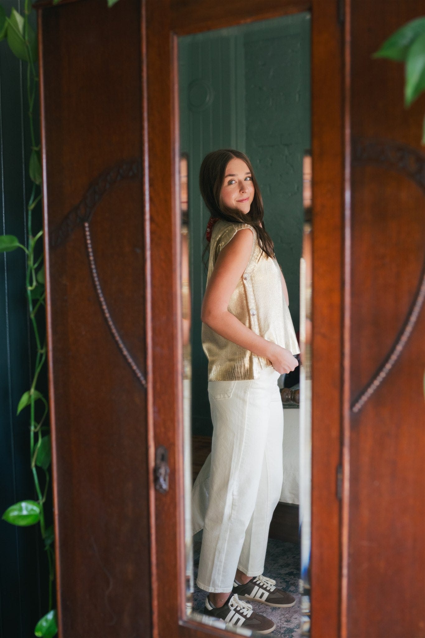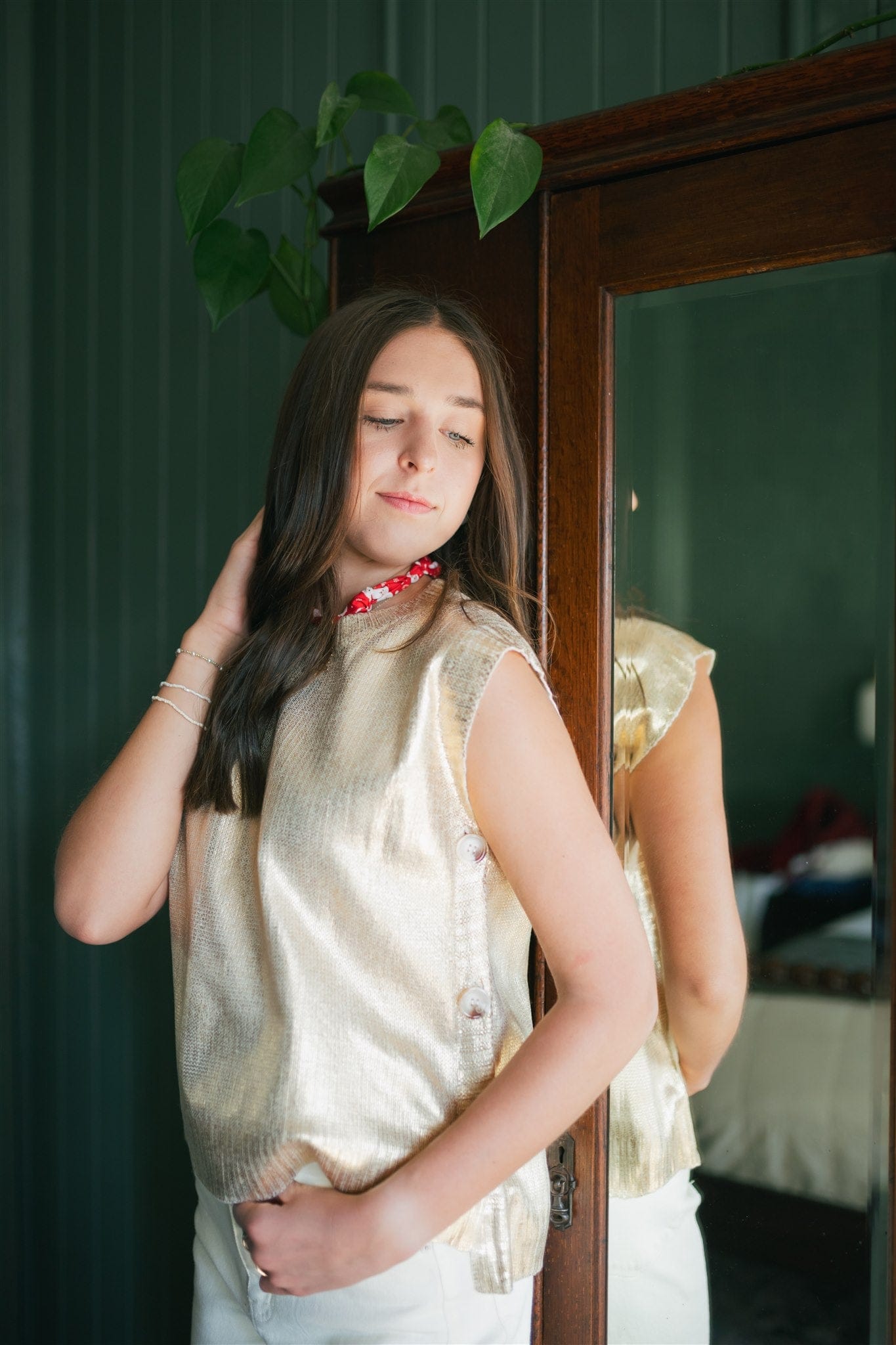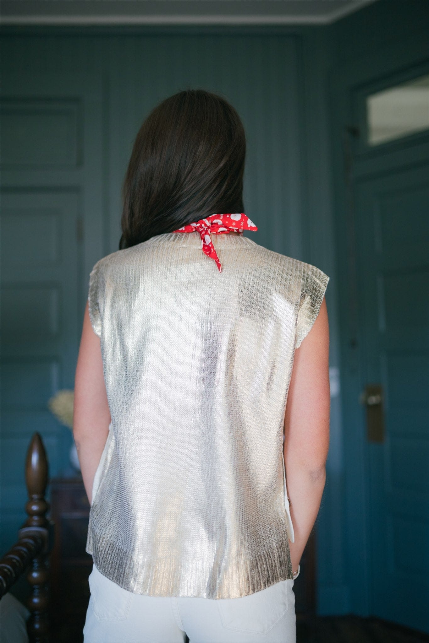 Elevate your holiday wardrobe with this stunning gold metallic sleeveless knit top. The shimmering fabric catches the light beautifully, making it perfect for festive gatherings and special occasions. Crafted from stretchy, lightweight knit, it moves with you for all-day comfort without the bulk. The flowy silhouette skims your frame gracefully, while the distinctive button side detail adds an unexpected touch of sophistication. Versatile enough to dress up with tailored trousers or down with your favorite jeans, this piece is a must-have for anyone seeking effortless elegance this season.