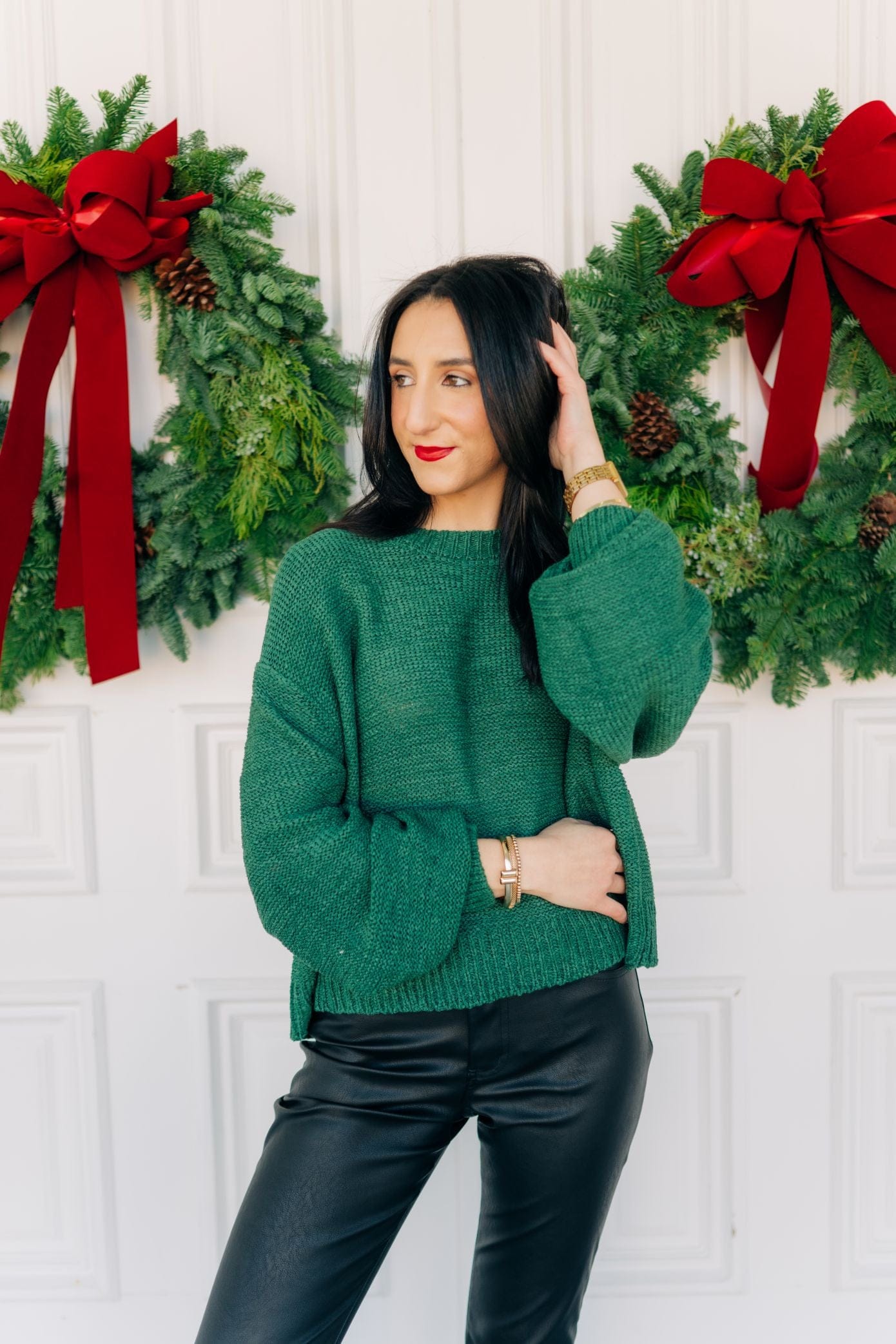 Elevate your holiday wardrobe with this stunning green balloon sleeve sweater—a versatile piece that effortlessly transitions from festive gatherings to everyday elegance. Crafted from a soft, stretchy knit, it drapes beautifully with a flowy silhouette that flatters every frame. The rounded neckline and voluminous balloon sleeves create a romantic, on-trend look that captures the season's most coveted style. Comfortable enough for all-day wear, this sweater pairs seamlessly with your favorite jeans, skirts, or trousers for endless styling possibilities.