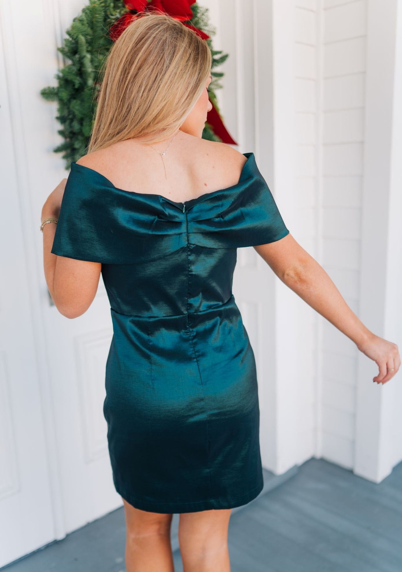 Elevate your holiday celebrations with this stunning hunter green cocktail dress. The luxurious satin fabric drapes beautifully while the off-the-shoulder neckline adds an effortlessly chic, sophisticated touch. A fitted silhouette flatters your figure and creates an elegant line perfect for festive gatherings, dinner parties, or special occasions. The rich jewel tone pairs seamlessly with statement jewelry and heels for a polished, memorable look. Timeless elegance meets modern style in this must-have holiday piece.
