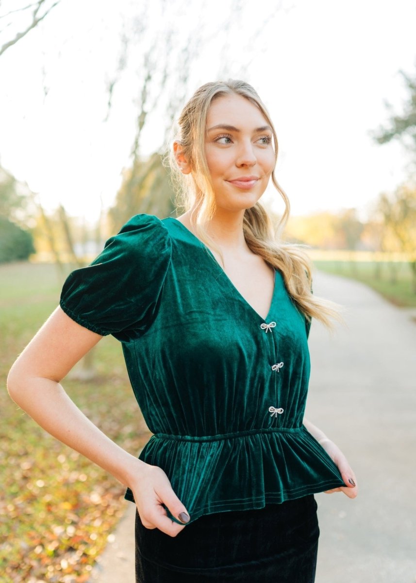 Green Rhinestone Bow Front Velvet Blouse