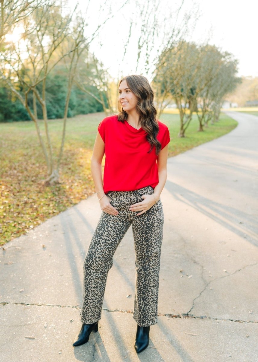 Elevate your holiday wardrobe with this stunning red satin blouse. The graceful cowl neckline creates an effortlessly elegant silhouette, while cap sleeves offer a flattering, feminine touch. Crafted from luxurious satin, the flowy fabric drapes beautifully and moves with you, making it perfect for festive gatherings, date nights, or elevated everyday wear. A versatile piece that transitions seamlessly from season to season, this top pairs beautifully with tailored trousers, skirts, or jeans for endless styling possibilities.