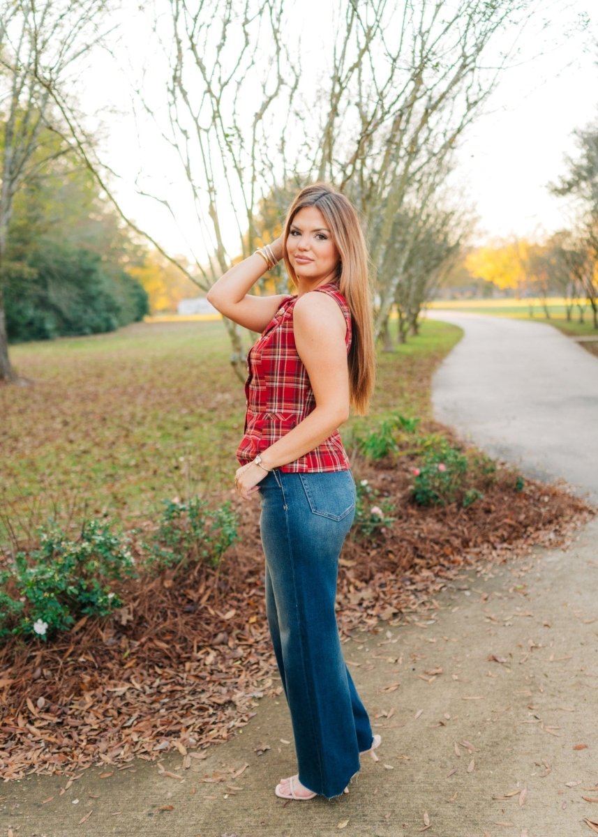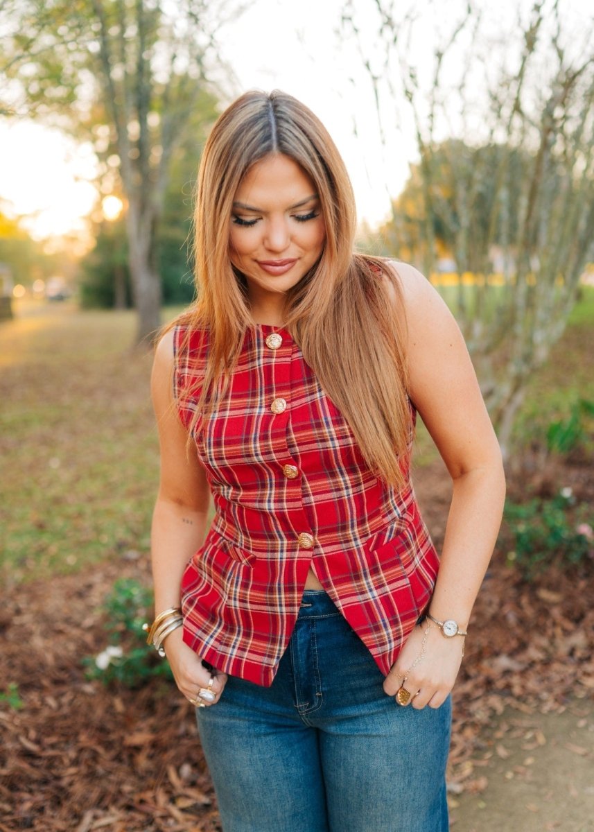 Red Plaid Button Up Sleeveless Vest