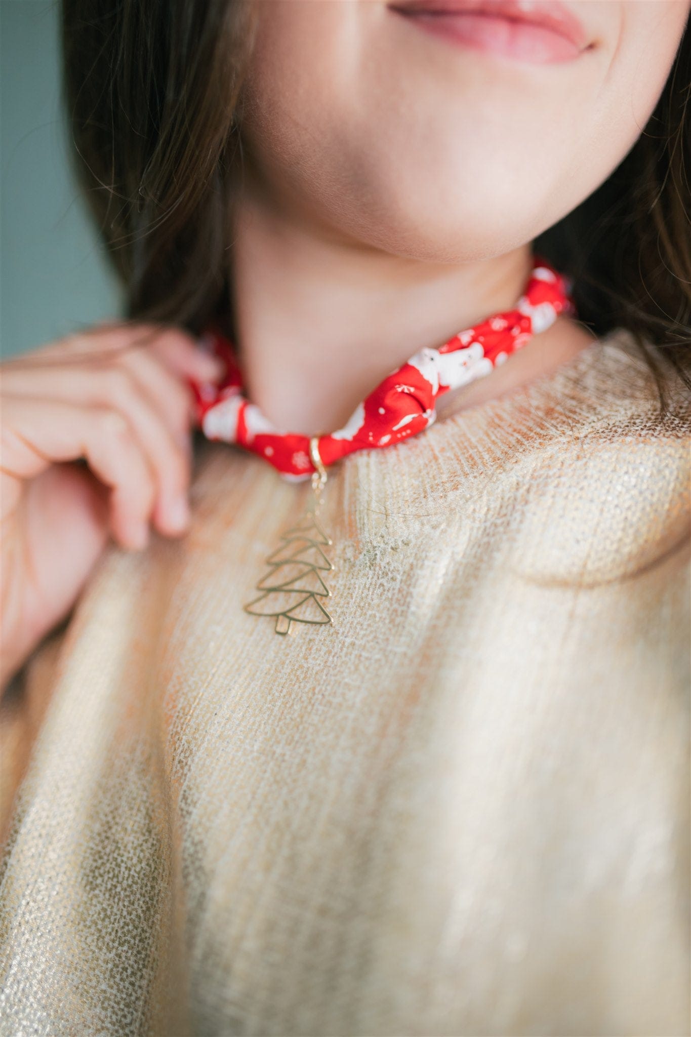 Meet our Christmas Santa Printed Silk Knotted Scarf Necklace, a festive addition to your holiday wardrobe. This unique accessory features a gold Christmas tree removable charm that adds a sparkle to your festive attire. This versatile piece can be worn as a scarf or a necklace, making it a perfect blend of style and functionality.