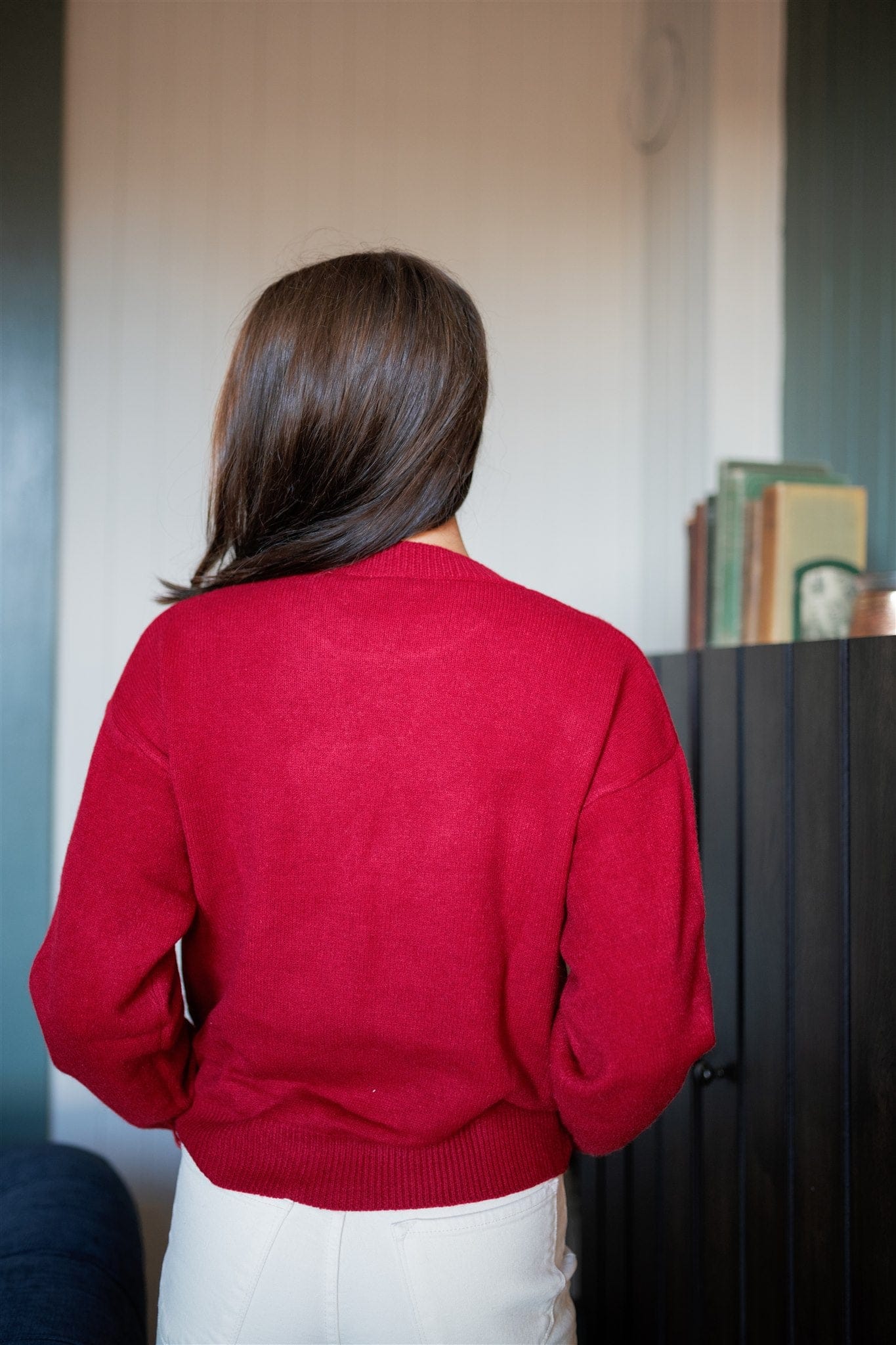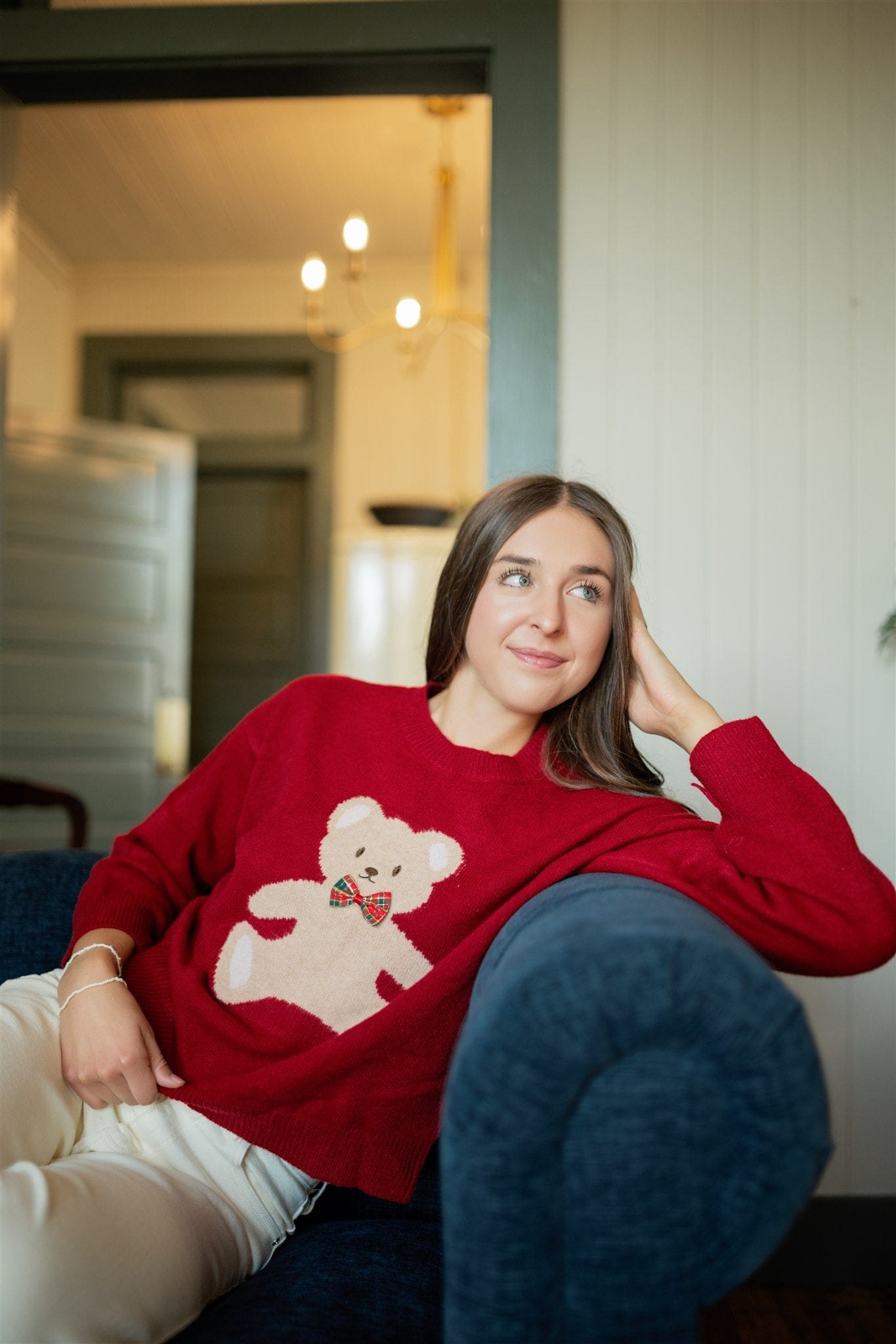 Celebrate the holiday season in cozy style with this Red Teddy Christmas Sweater. Featuring long sleeves and a comfortable, rounded neckline, its soft knit fabric keeps you warm while showcasing a charming teddy bear design on the front. Perfect for festive gatherings or casual winter days, this sweater effortlessly blends comfort with holiday cheer.