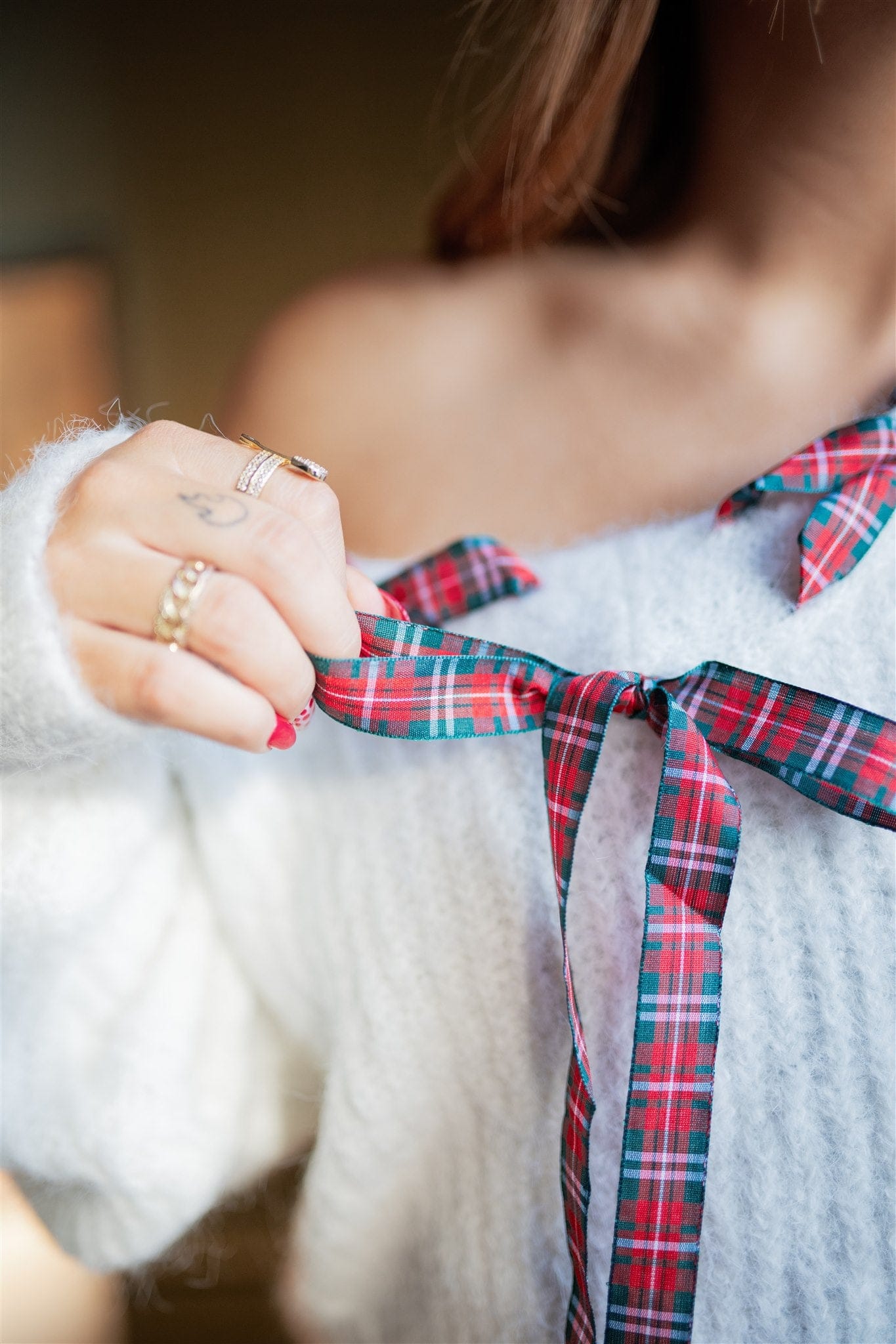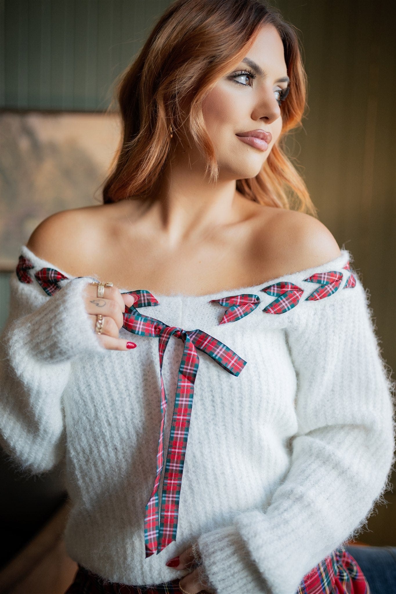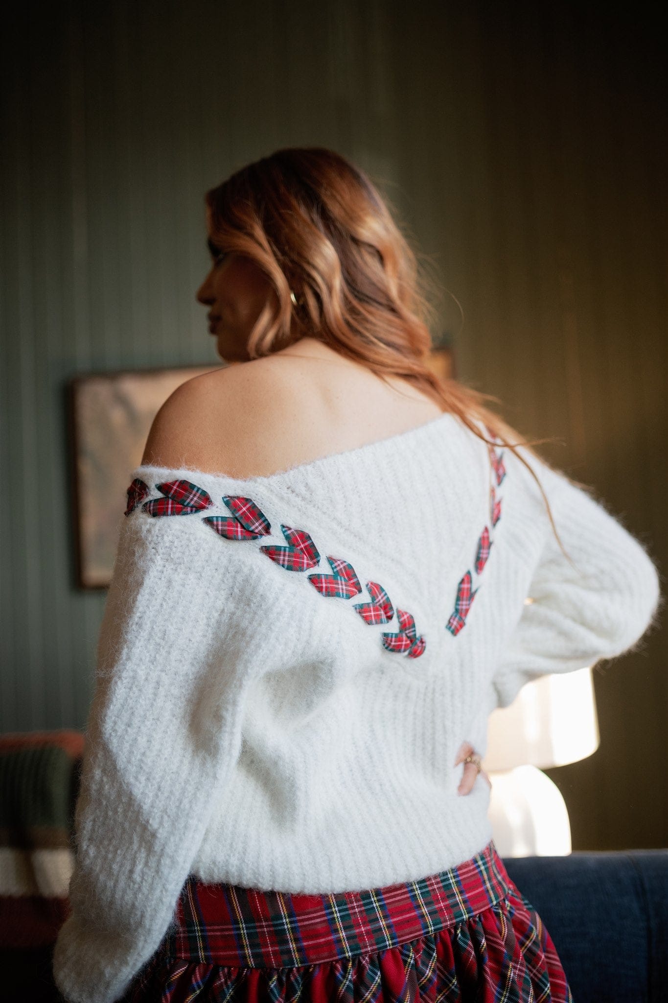 Embrace cozy holiday style with this white knit sweater featuring long sleeves and a flattering v-neckline. The festive Christmas plaid ribbon detail adds a charming seasonal touch, making it perfect for holiday gatherings and winter celebrations. Soft, warm, and stylish, this sweater effortlessly combines comfort with festive elegance to brighten your wardrobe all season long.
