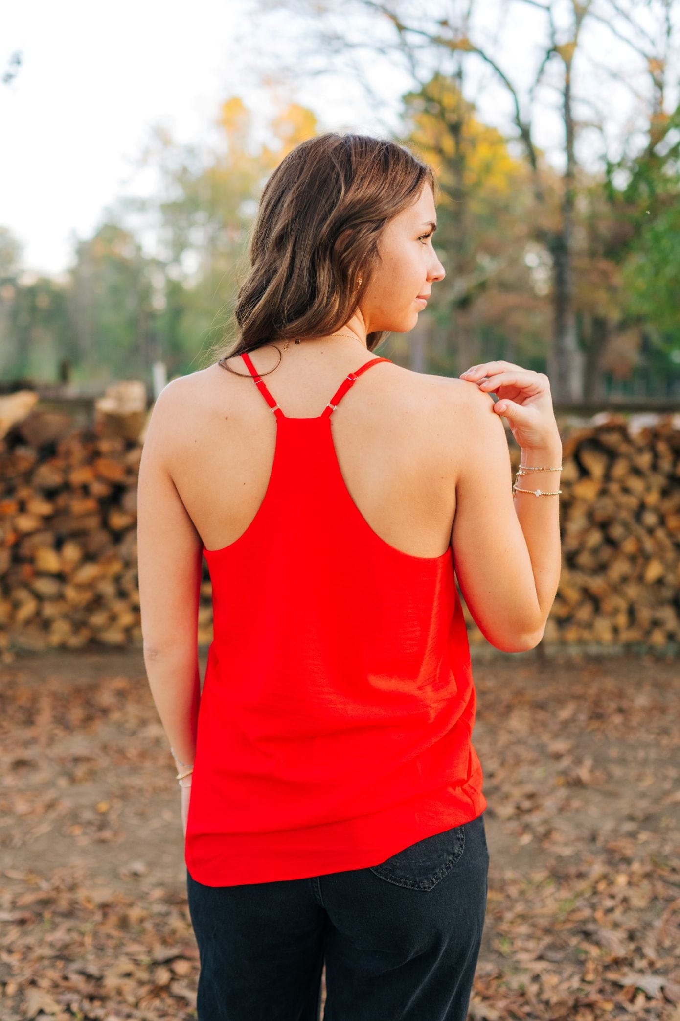 Elevate your wardrobe with this red cami featuring adjustable spaghetti straps for a perfect fit. Its flattering v-neckline and lightweight, flowy fabric offer both comfort and style, making it an ideal choice for layering or wearing on its own. Perfect for warm days or casual outings, this versatile top adds a vibrant pop of color to any outfit.