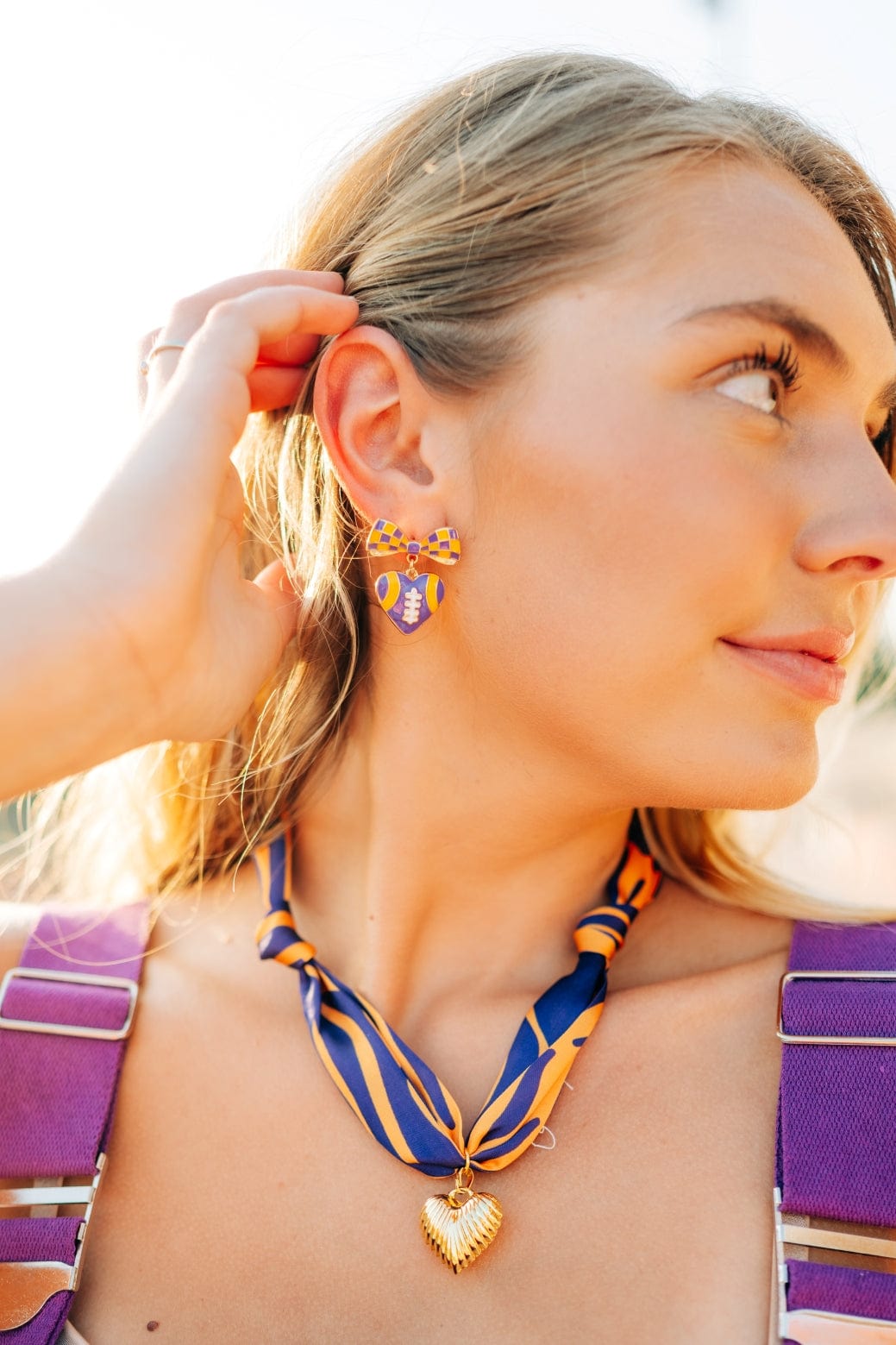 Show your team spirit with these playful purple and gold heart-shaped football stud earrings. Featuring a charming checkered pattern and a cute bow detail, they’re perfect for game day or any LSU fan looking to add a fun, spirited touch to their outfit. Lightweight and easy to wear, these studs make cheering on your team stylish and comfortable.