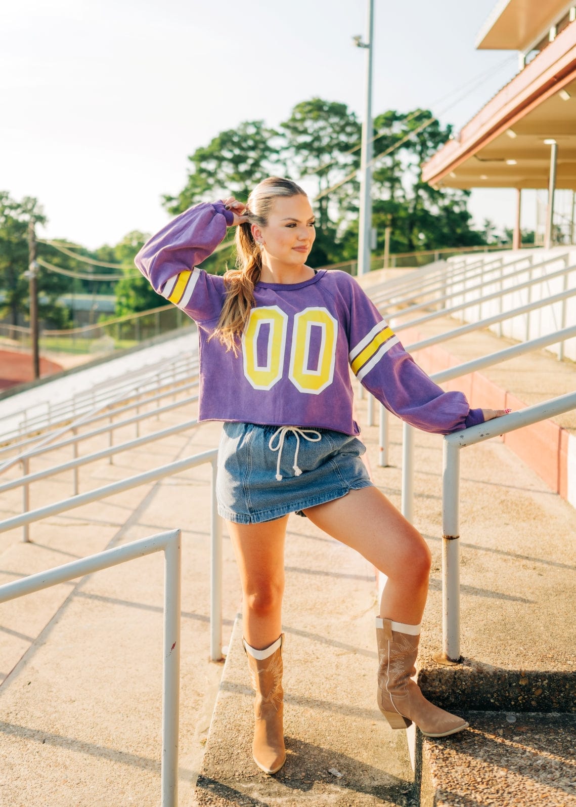 Show your team spirit in style with this purple and gold long sleeve jersey top. Designed with a rounded neckline and a flowy, loose fit, it offers comfort and ease of movement all game day long. The stretchy fabric ensures a perfect fit while keeping you comfortable whether you're cheering from the stands or watching at home. Perfect for LSU fans looking to combine support and style effortlessly.