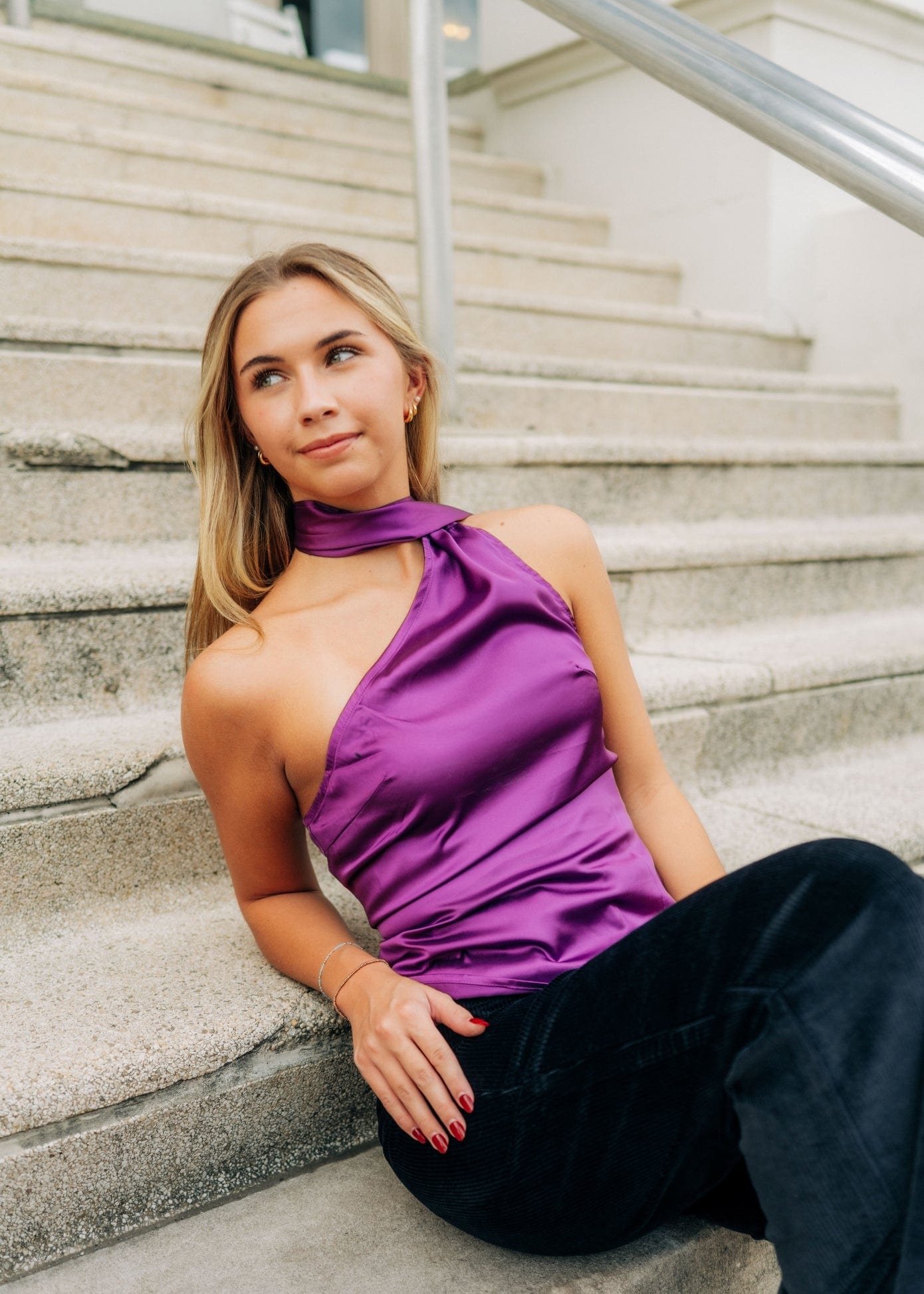 Elevate your LSU Gameday look with this purple satin one-shoulder top. Featuring a sleek sleeveless design and a stylish scarf detail, it combines trendy flair with comfortable elegance. Perfect for showing your school spirit with a touch of sophistication, this top will keep you looking chic and confident all game day long.