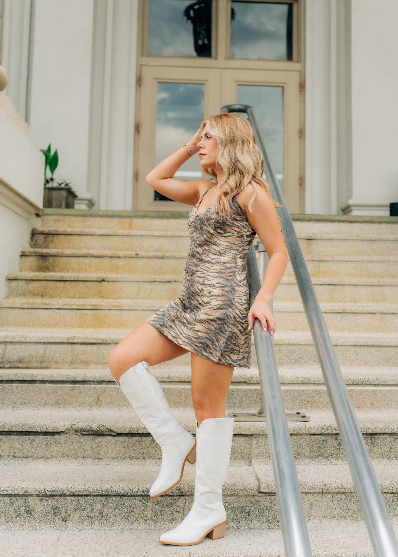 Step into the spotlight with the Nova Tiger Mini Dress-a bold, playful piece for the adventurous fashionista! This mini dress features a fierce tiger print on soft, breathable denim, adjustable spaghetti straps for a custom fit, and an eye-catching open detail at the front. The hidden zipper at the side makes it easy to slip on, while the design keeps things fun, flirty, and effortlessly cool.
