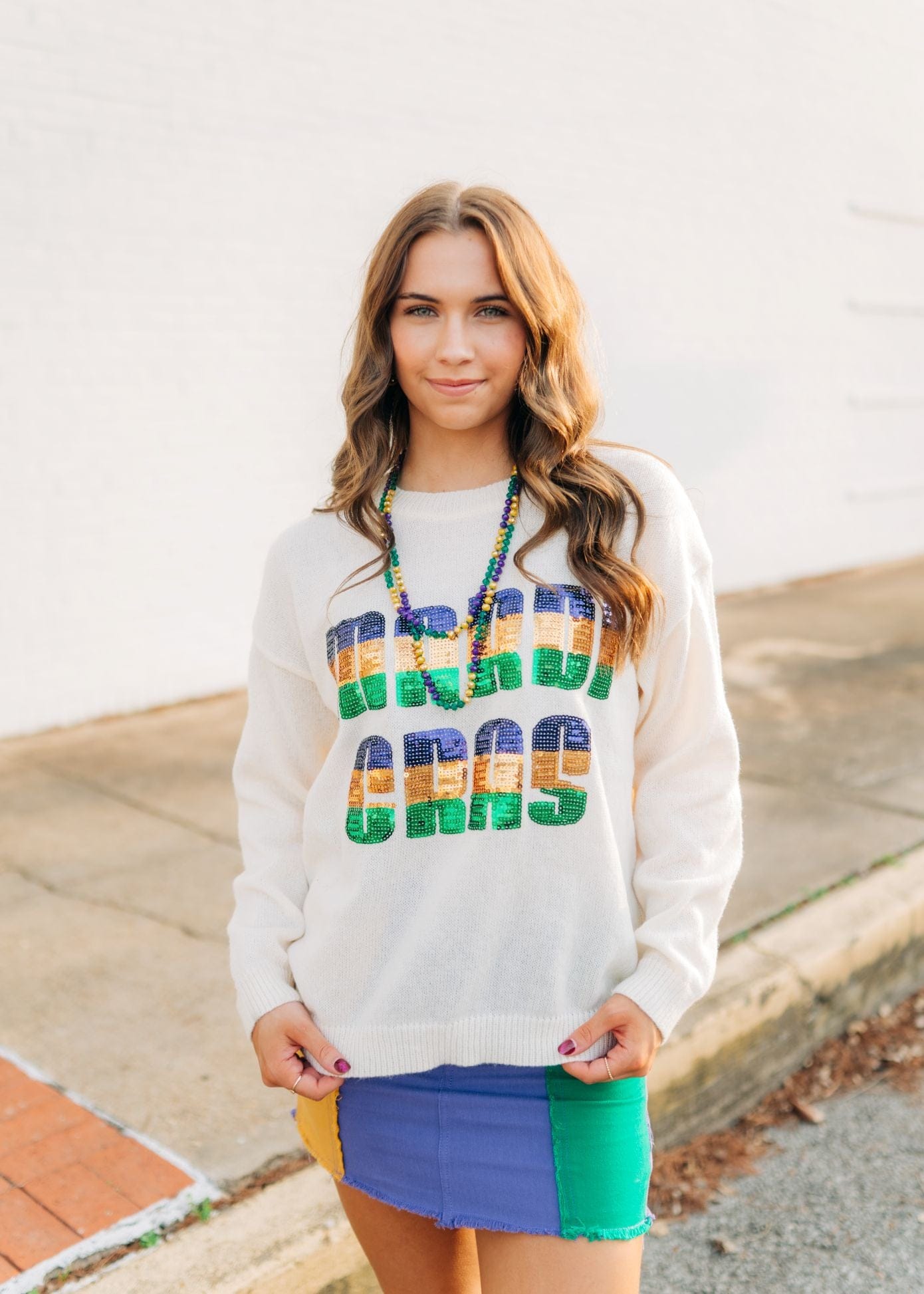 Celebrate in style with this eye-catching white sweater featuring shimmering "Mardi Gras" sequins across the front. The soft, stretchy knit fabric drapes beautifully with a relaxed, flowy silhouette that moves with you. Rounded neckline and long sleeves offer timeless comfort, while the sequin detail adds just the right amount of festive sparkle. Perfect for holiday parties, themed events, or anyone ready to bring bold, playful energy to their wardrobe.