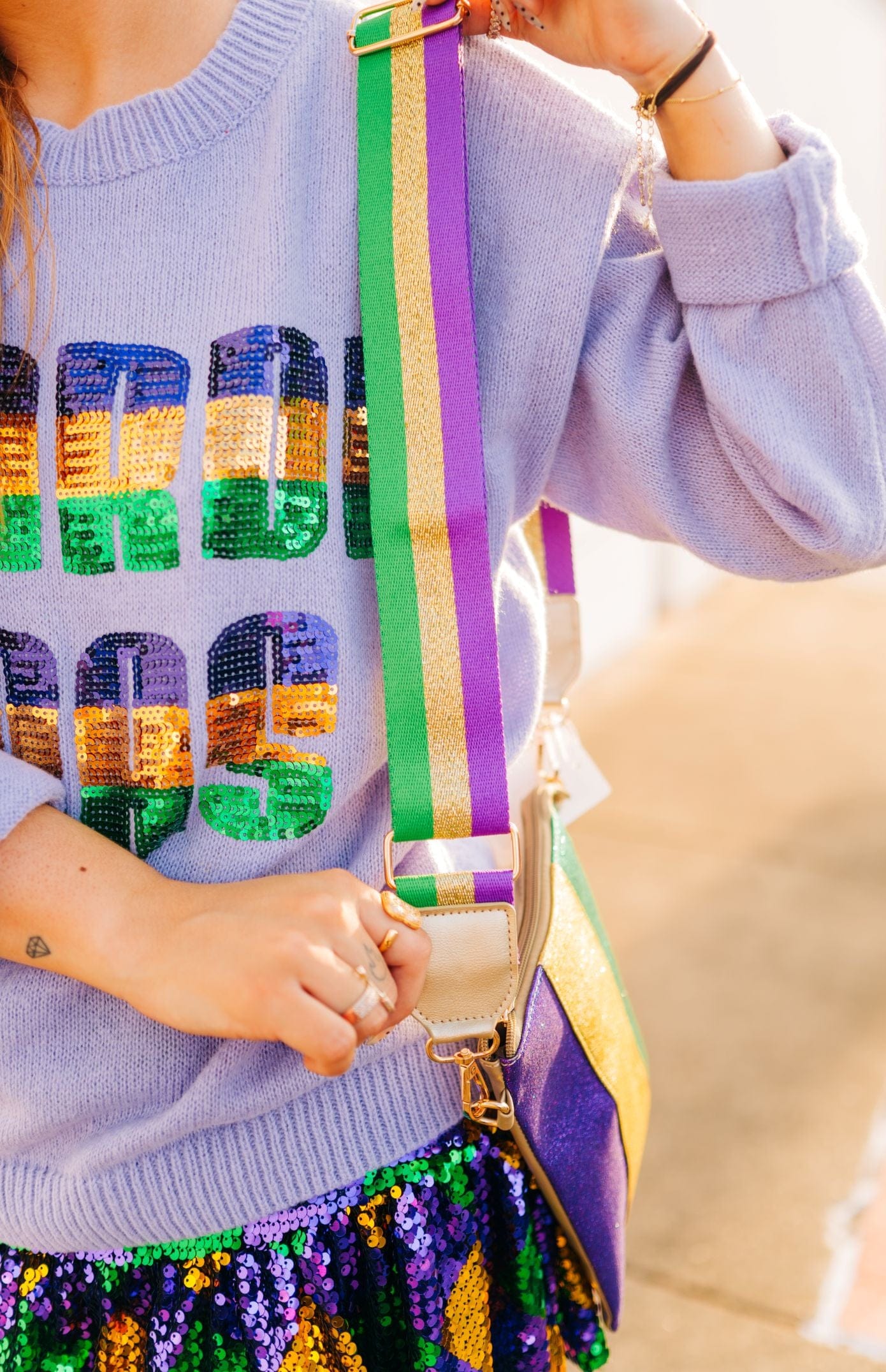 Elevate your everyday carry with this vibrant Mardi Gras striped bag strap, featuring bold purple, green, and gold stripes that instantly transform any tote or crossbody. Perfect for adding festival flair to your accessory collection, this versatile strap brings celebratory color and personality to your style. Whether you're channeling New Orleans spirit year-round or prepping for the season, this eye-catching piece makes a statement while keeping your bag secure and comfortable. A must-have accent for fashion-forward accessory lovers.