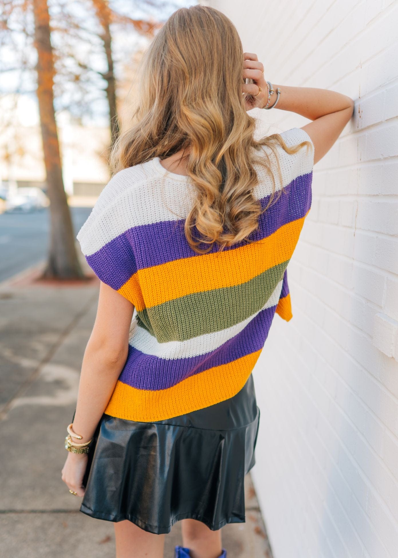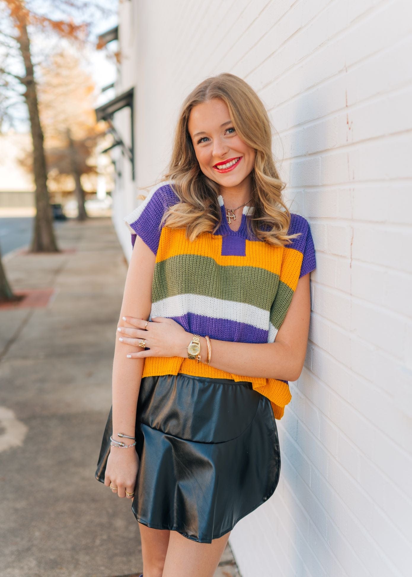 Celebrate in style with this vibrant Mardi Gras striped knit top. Featuring a flattering V-neckline and short sleeves, the stretchy fabric moves with you while the flowy silhouette keeps you comfortable all day long. Perfect for festive occasions or adding a pop of color to your everyday rotation, this versatile piece transitions seamlessly from casual outings to special events. The soft knit construction ensures breathability and ease of wear.