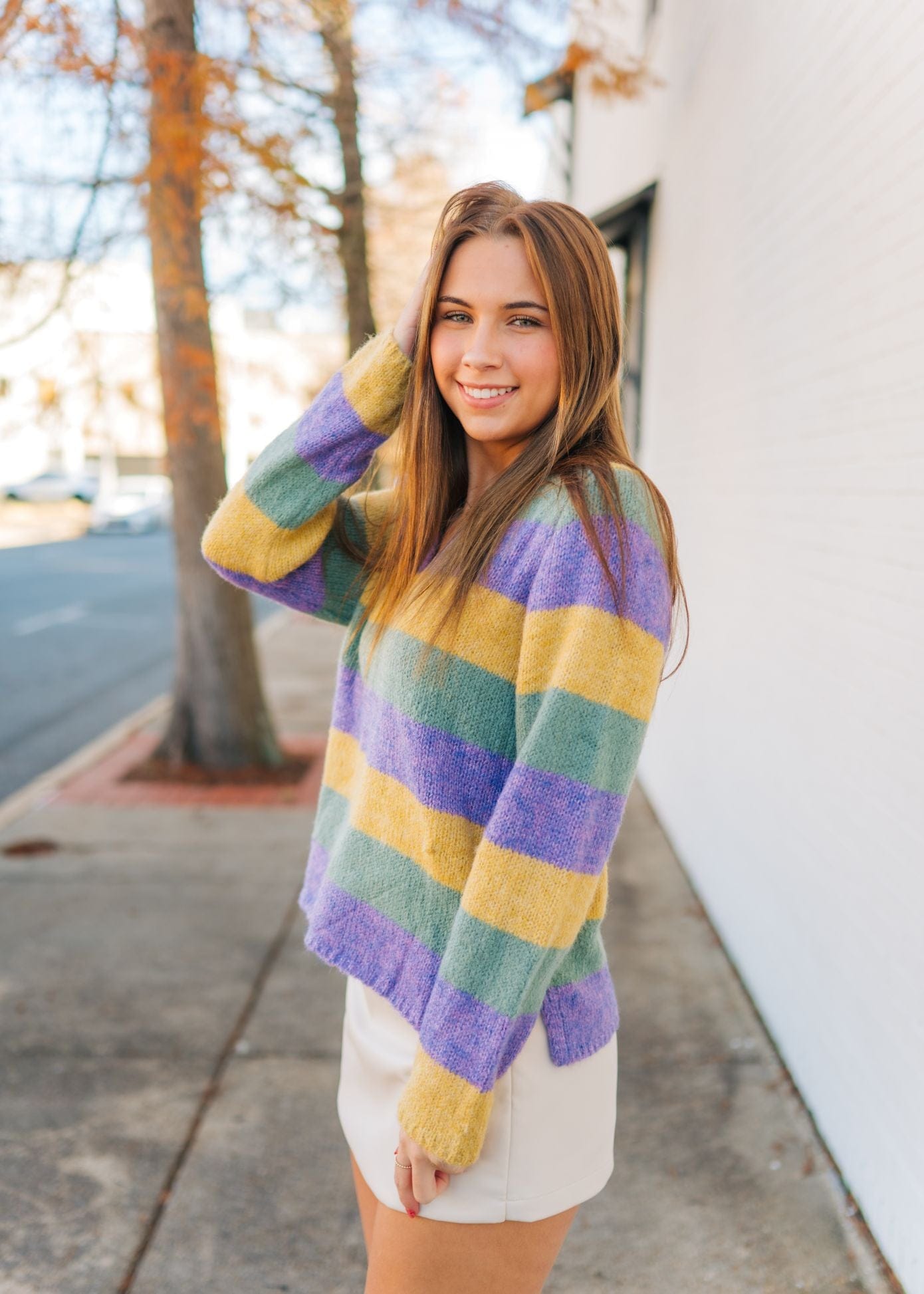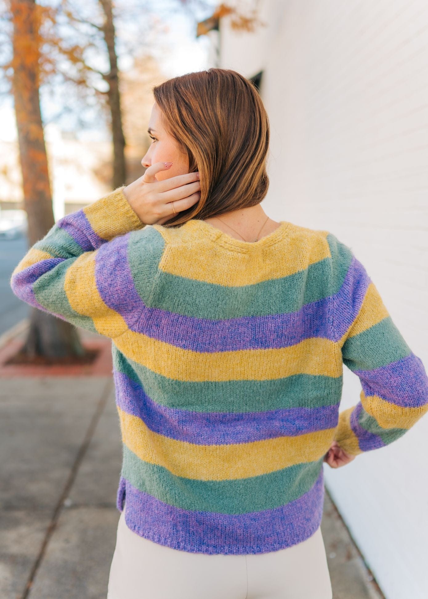 Celebrate in style with this vibrant Mardi Gras V-neck striped sweater, featuring bold purple, green, and yellow stripes that capture the spirit of the season. Crafted from soft, luxurious fabric, the flowy silhouette drapes beautifully while the long sleeves and flattering V-neckline create an effortlessly chic look. Perfect for festive gatherings or adding a pop of color to your everyday wardrobe, this statement piece combines comfort with eye-catching design that turns heads wherever you go.