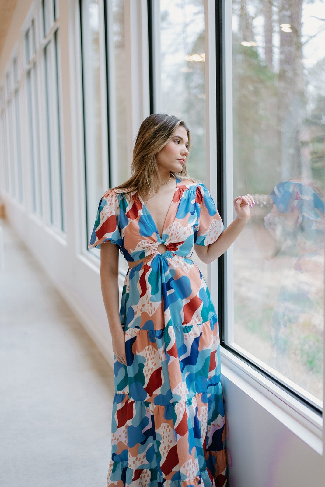 Indulge in effortless elegance with our Blue Cut Out Maxi Dress! Featuring a flattering v-neckline and short puff sleeves, this dress also boasts side cut outs that add a touch of allure. Its flowy, tiered design guarantees a comfortable and stylish fit. Perfect for any occasion, this dress will make you feel confident and beautiful.