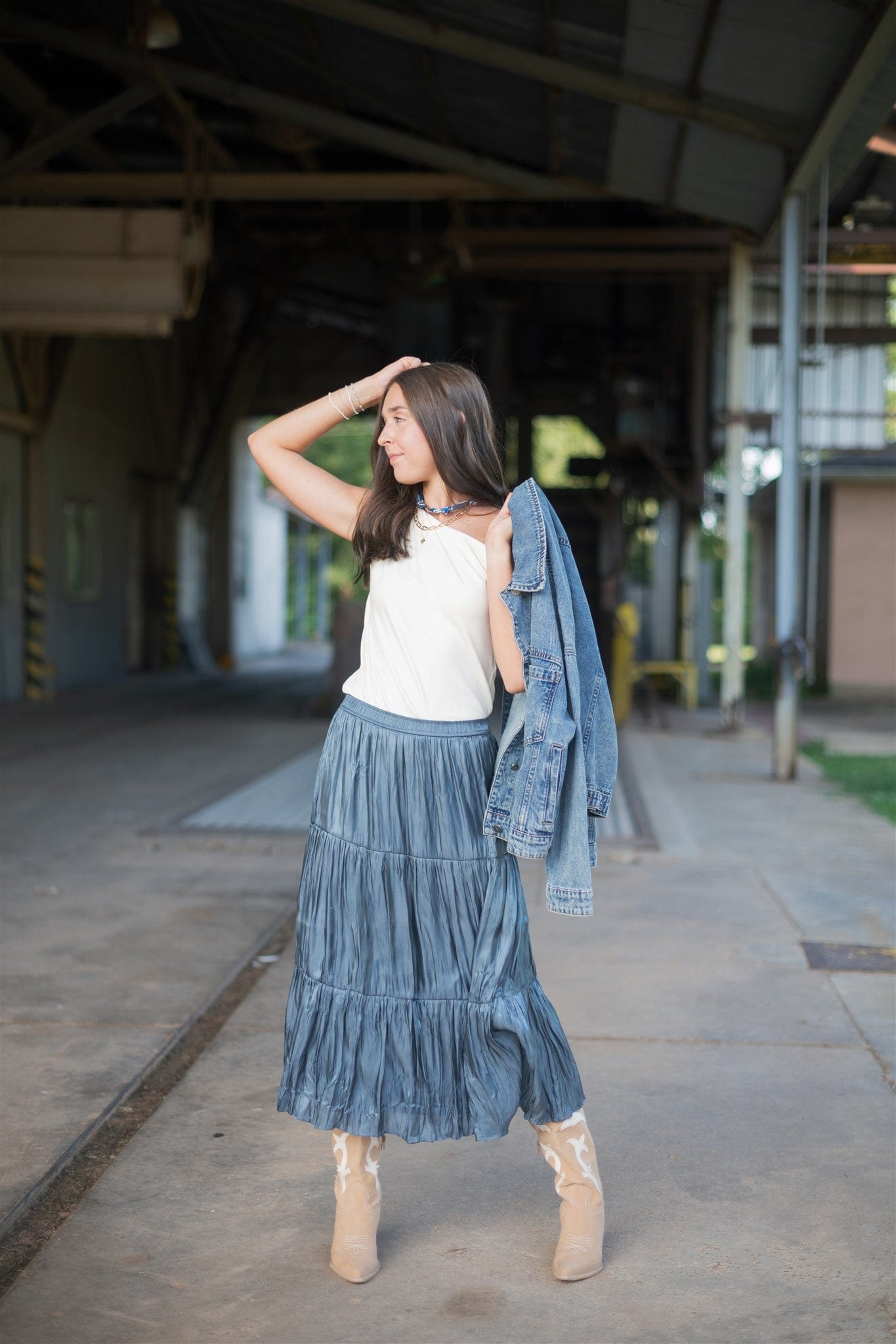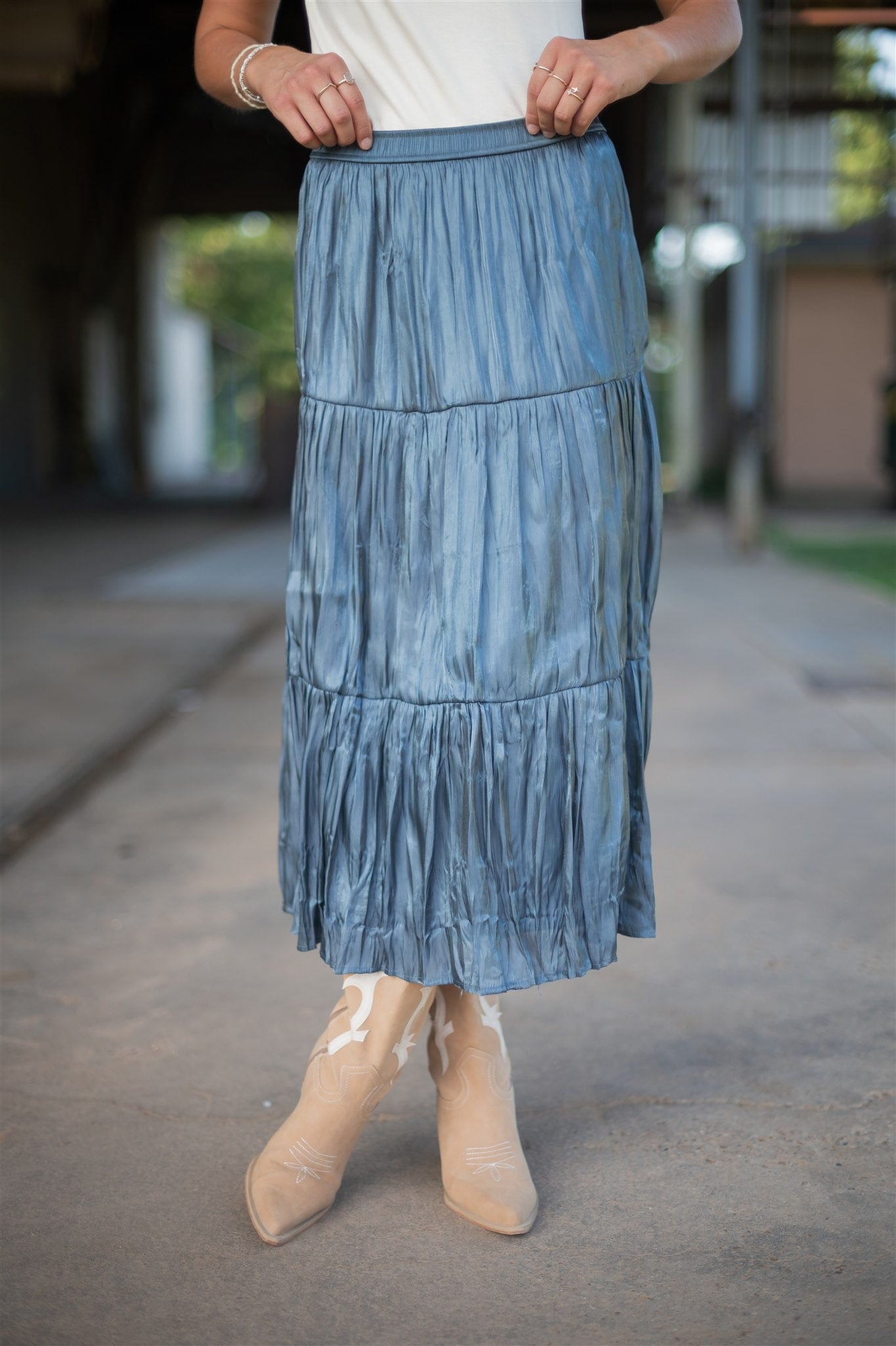 Elevate your style with our stunning Blue Shimmer Tiered Satin Maxi Skirt! The shimmering satin fabric catches the light as the flowy tiers add dimension and movement to your look. The elastic waistband ensures a comfortable and flattering fit, making this a must-have for any occasion.