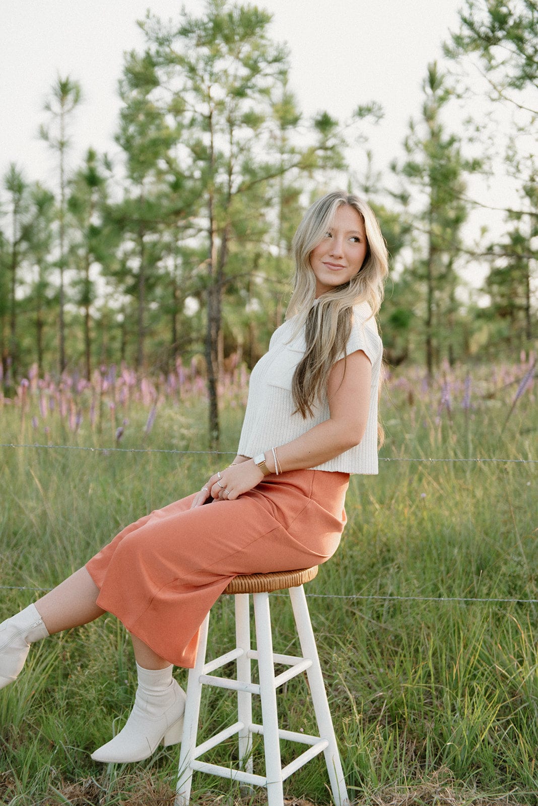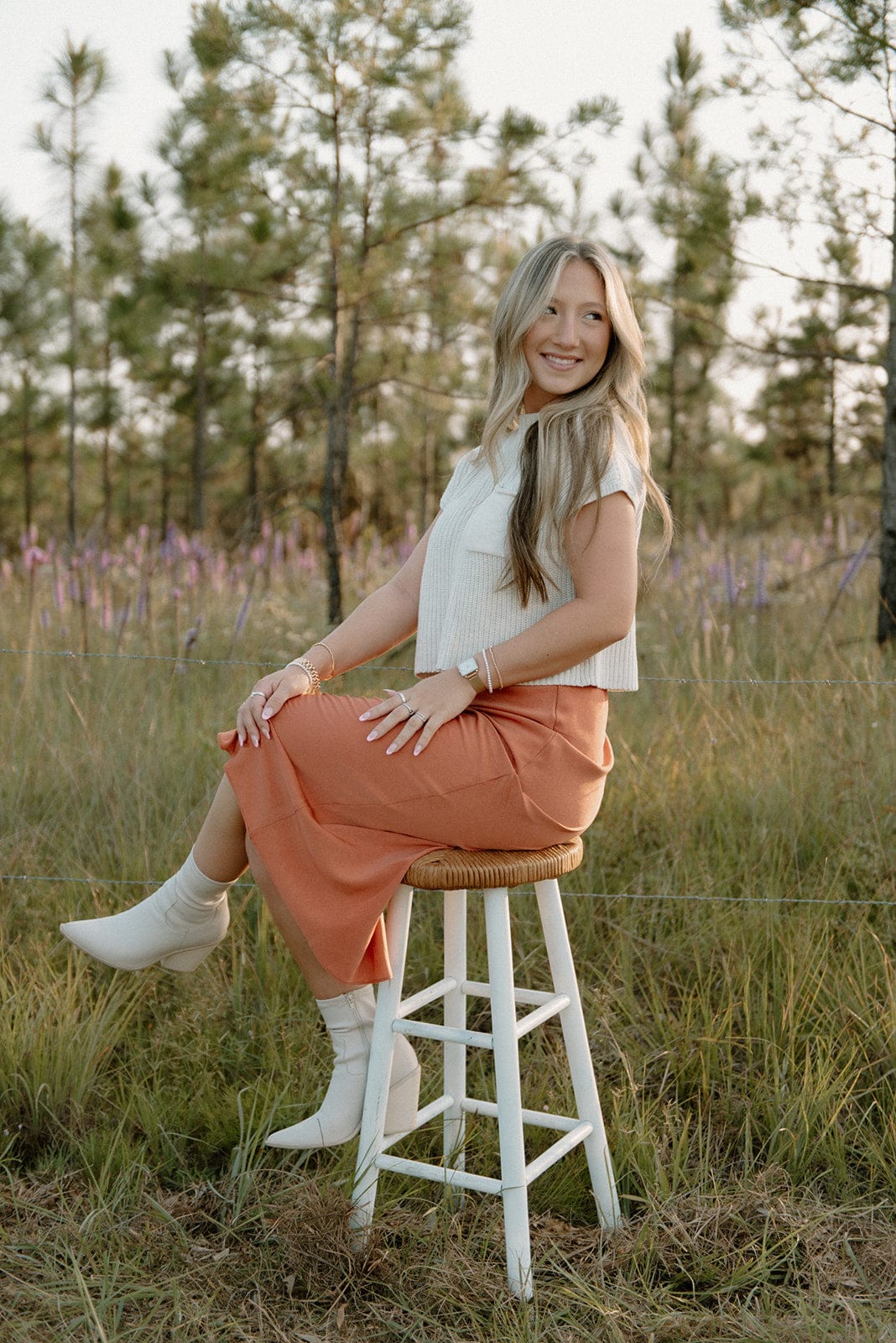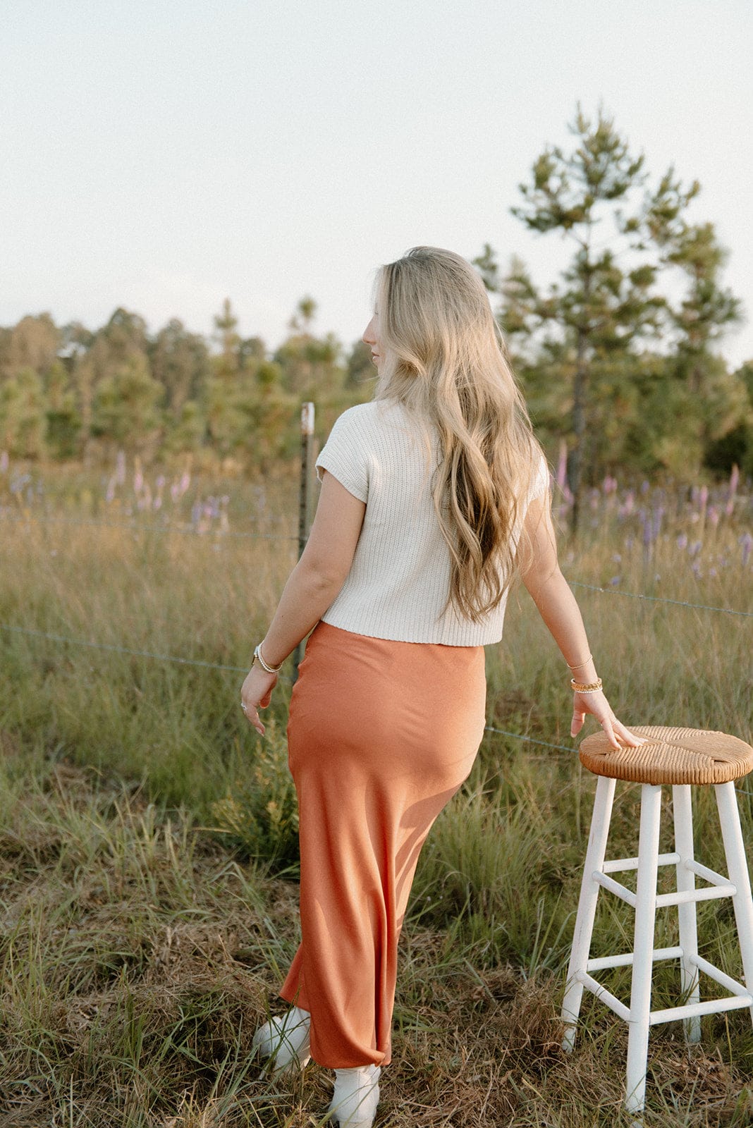Make a statement with our rust satin maxi skirt! Its beautiful rust orange color and luxurious satin material will elevate any outfit. Plus, the elastic waistband allows for a comfortable and flattering fit. Perfect for any occasion, this skirt is a must-have for your Fall fashion wardrobe!