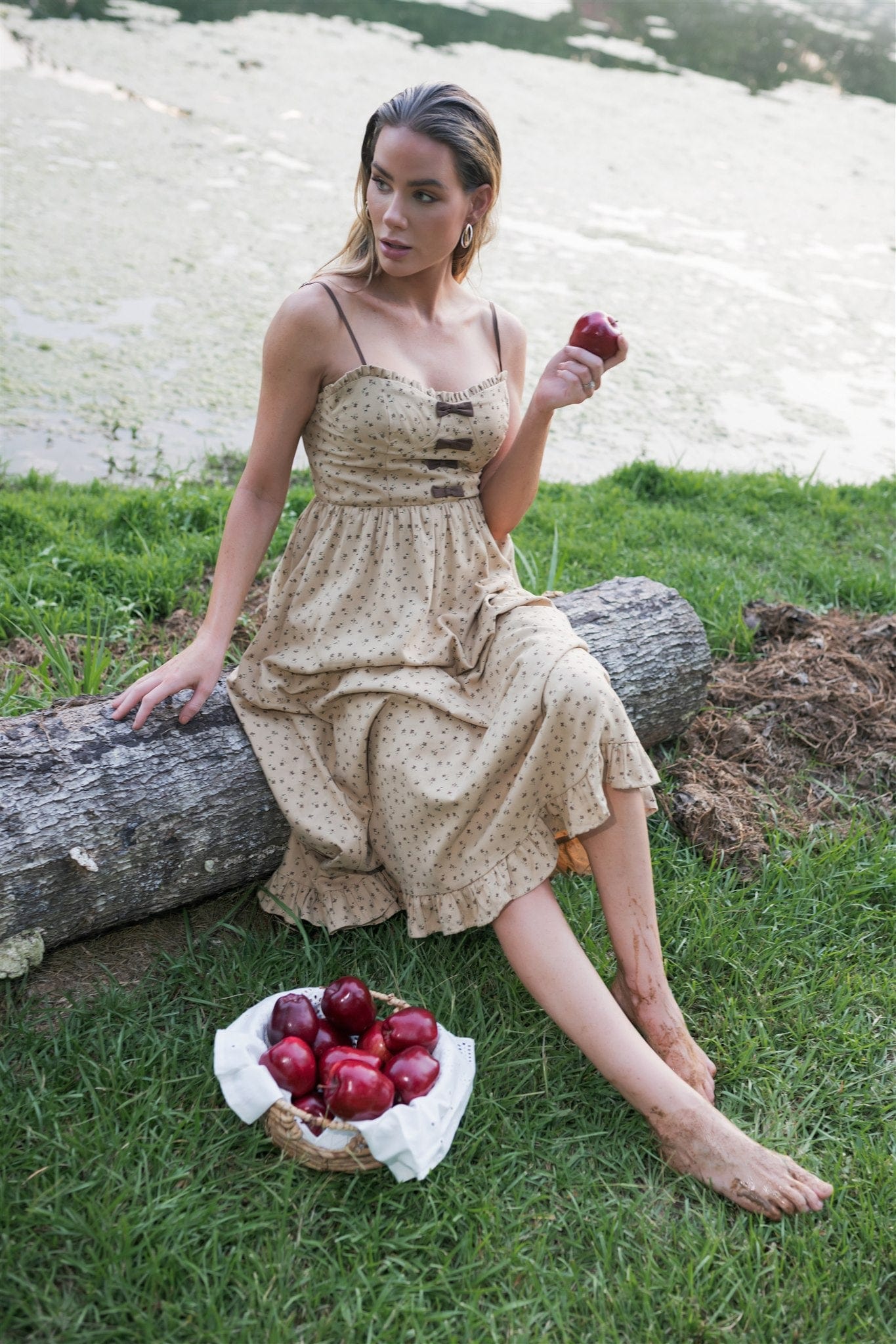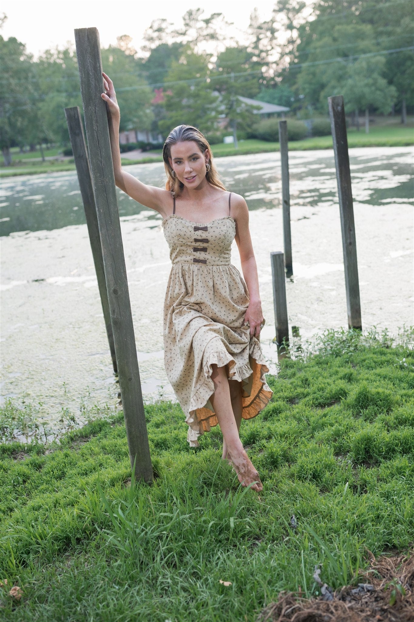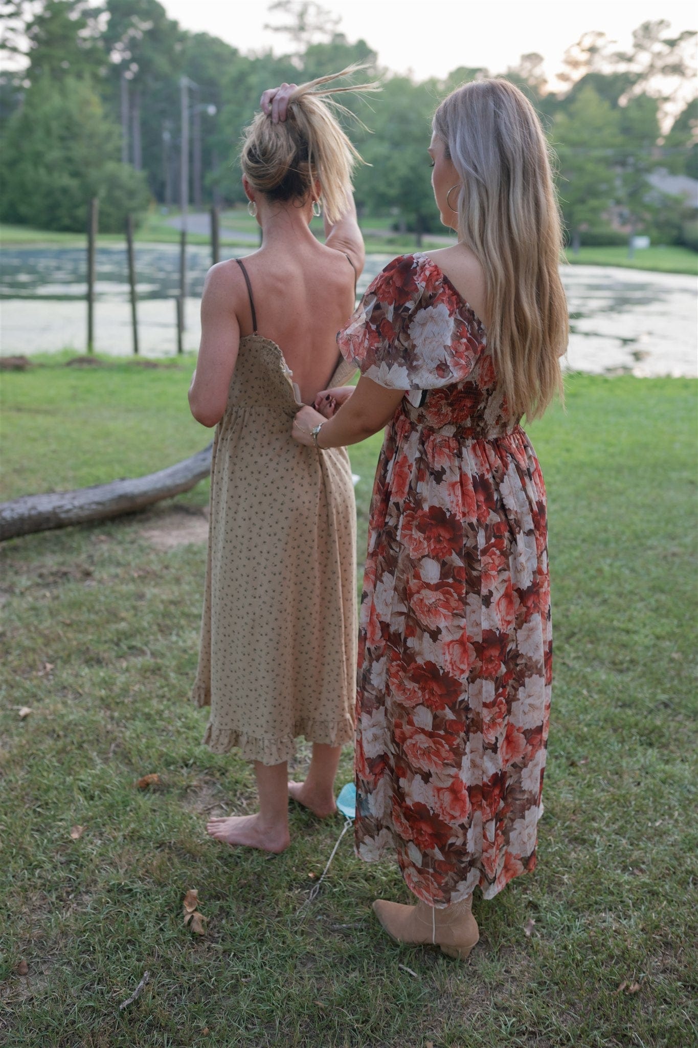 Elevate your floral wardrobe with our Taupe Bow Detail Floral Midi Dress! The adjustable spaghetti straps and smocked back detail provide a comfortable and flattering fit, while the flowy midi length adds a touch of elegance. Complete with a bow front detail and a back zip closure, this dress will be your go-to for any occasion.