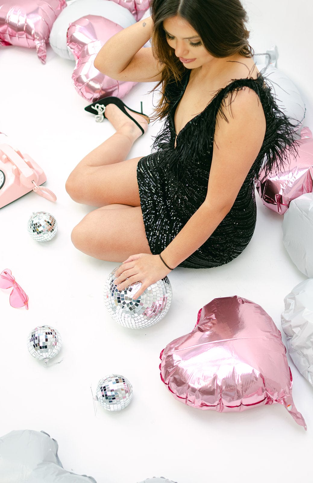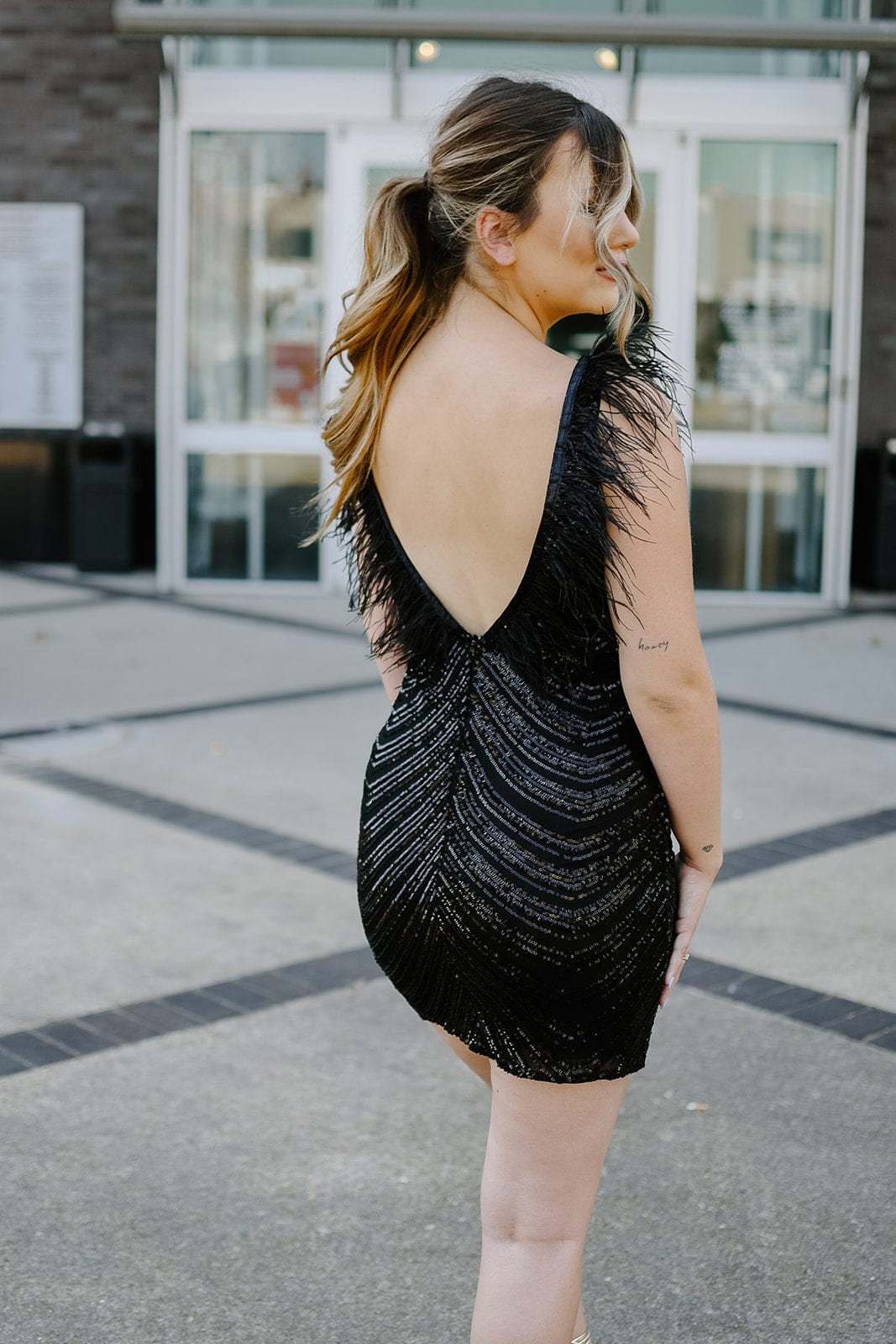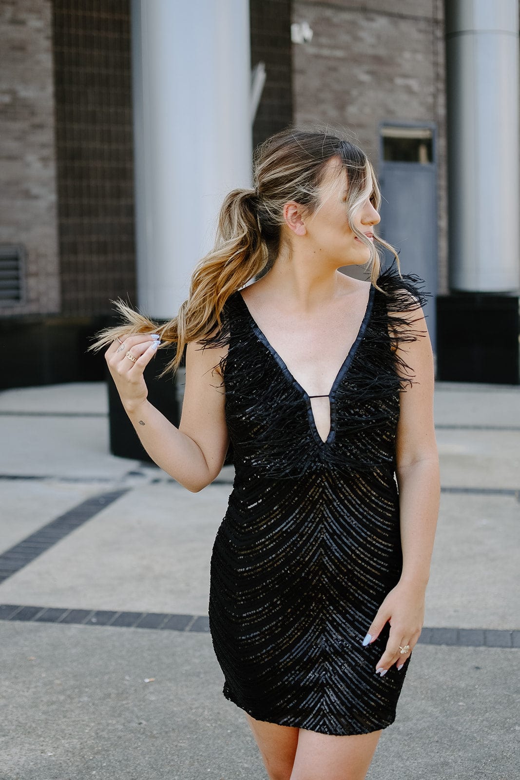 Certainly not your basic black dress, our Black Sequin Feather Cocktail Dress is a stunning and glamorous beauty designed to make a bold statement at upscale events and cocktail parties. This dress combines the elegance of black sequins with the whimsy of feather detailing to create a luxurious and eye-catching ensemble.