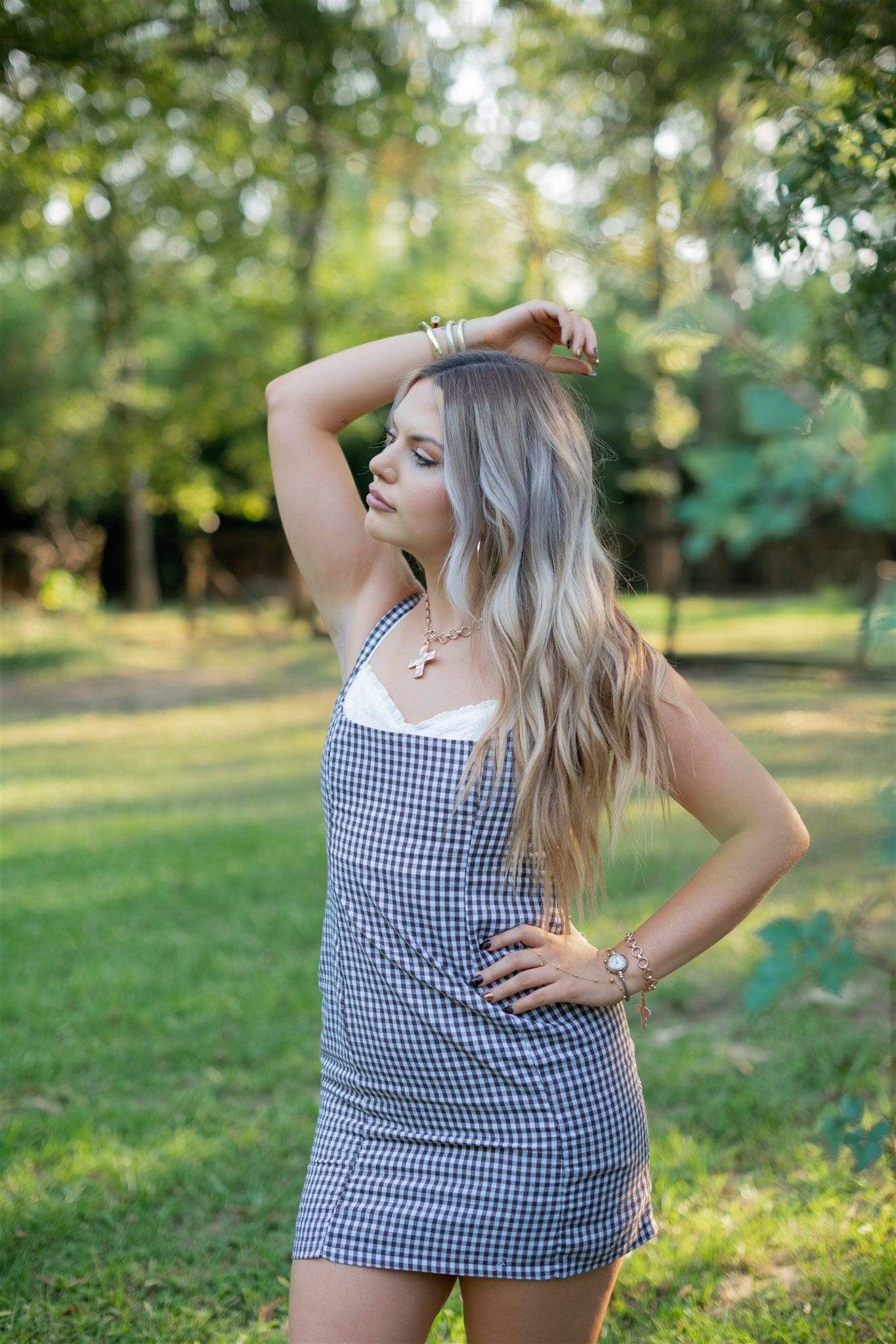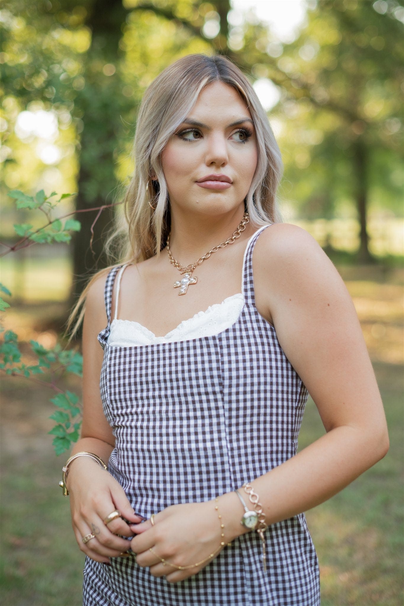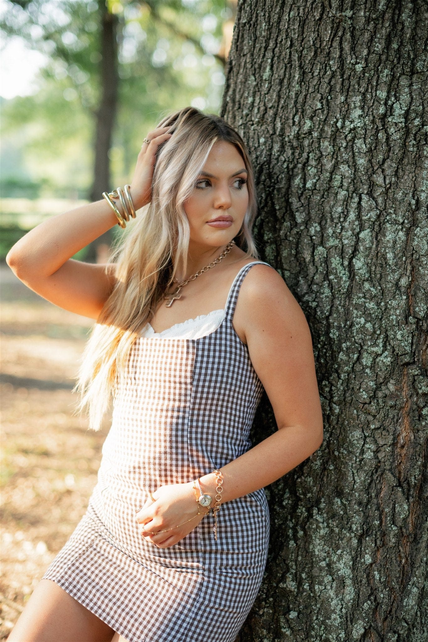 This brown and white checkered mini dress features a flattering sweetheart neckline and delicate spaghetti straps, perfect for embracing the fall transition in style. Its fitted silhouette highlights your shape while the sleeveless design keeps it versatile for layering. Ideal for both casual outings and dressier occasions, this dress combines classic pattern with modern charm to elevate your wardrobe effortlessly.