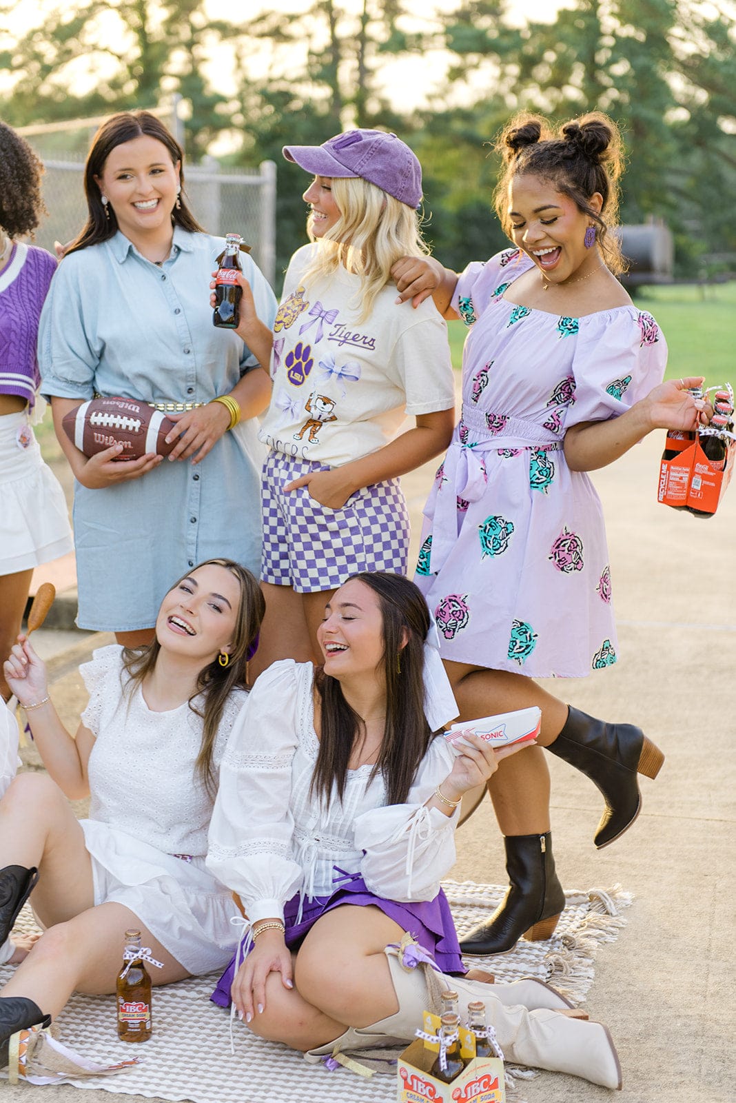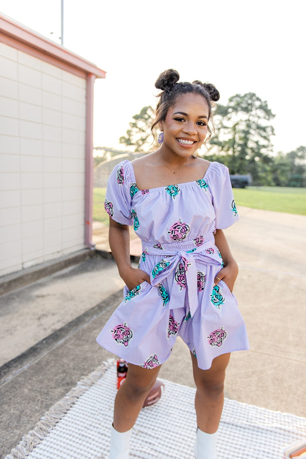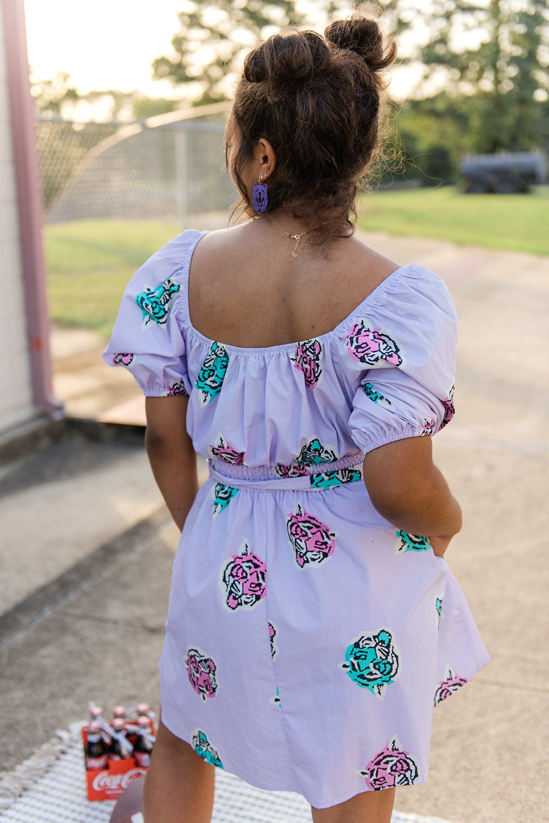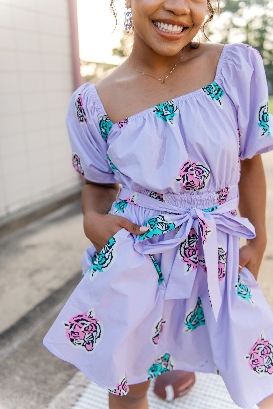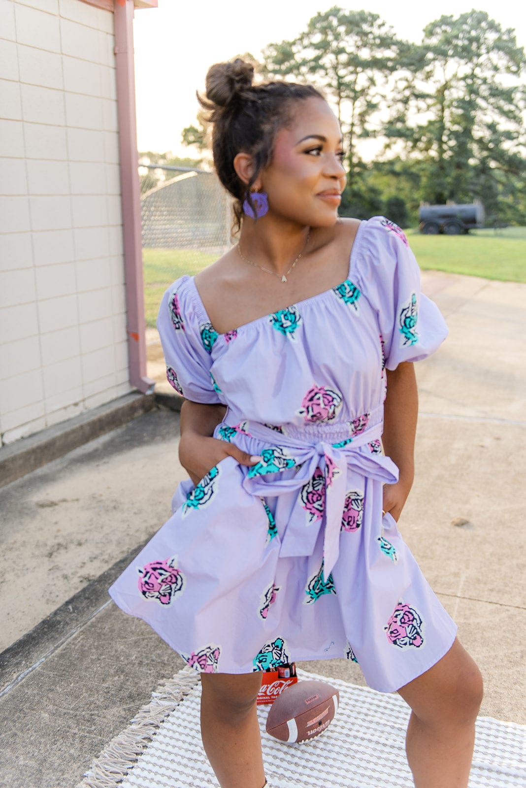 Elevate your gameday look with our Lavender Tiger Babydoll Dress. The short puff sleeves and flowy design provide both comfort and style. The tiger head details add a fierce touch, while the tie waist creates a flattering silhouette. Show your team spirit in this square neckline dress perfect for an LSU gameday!