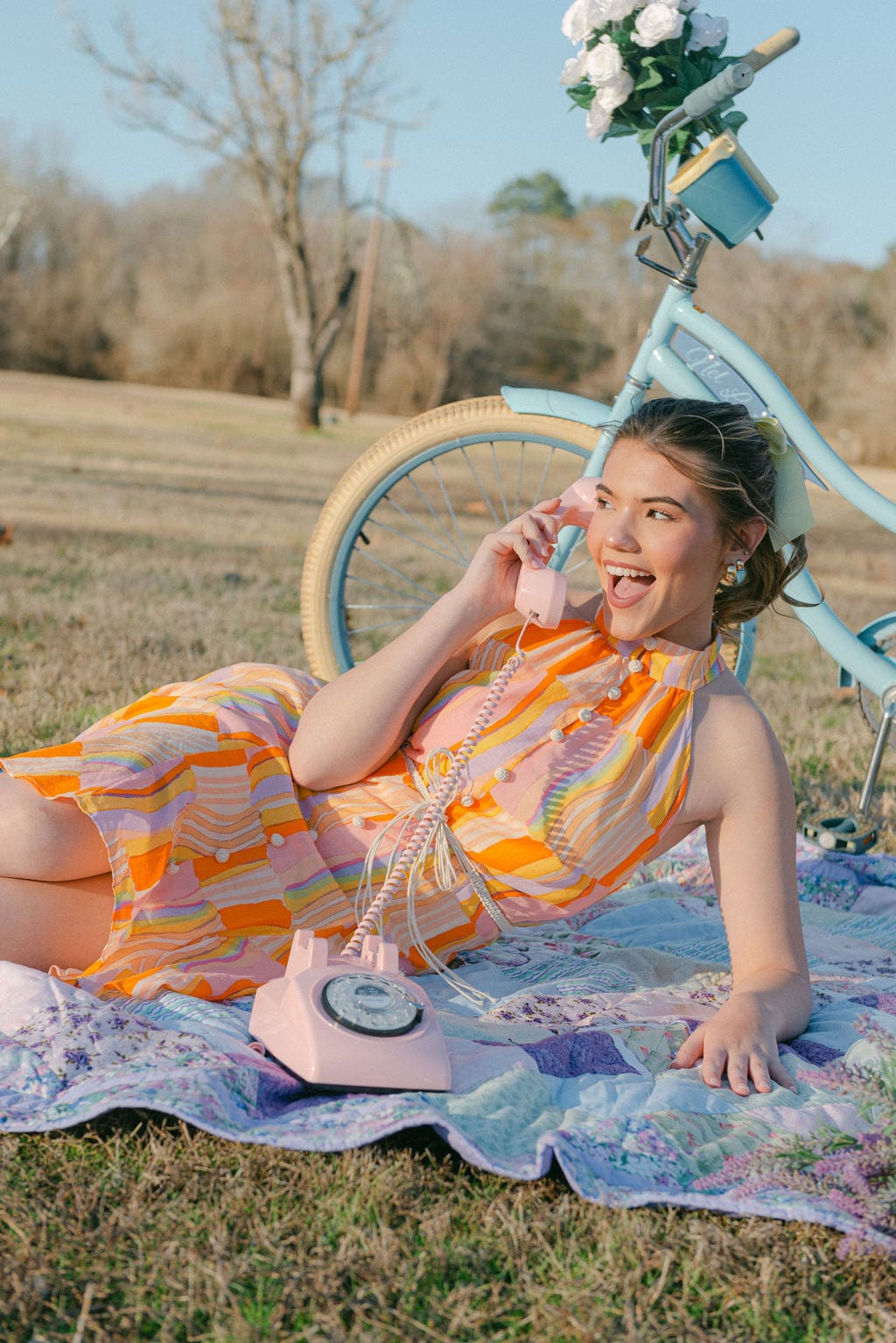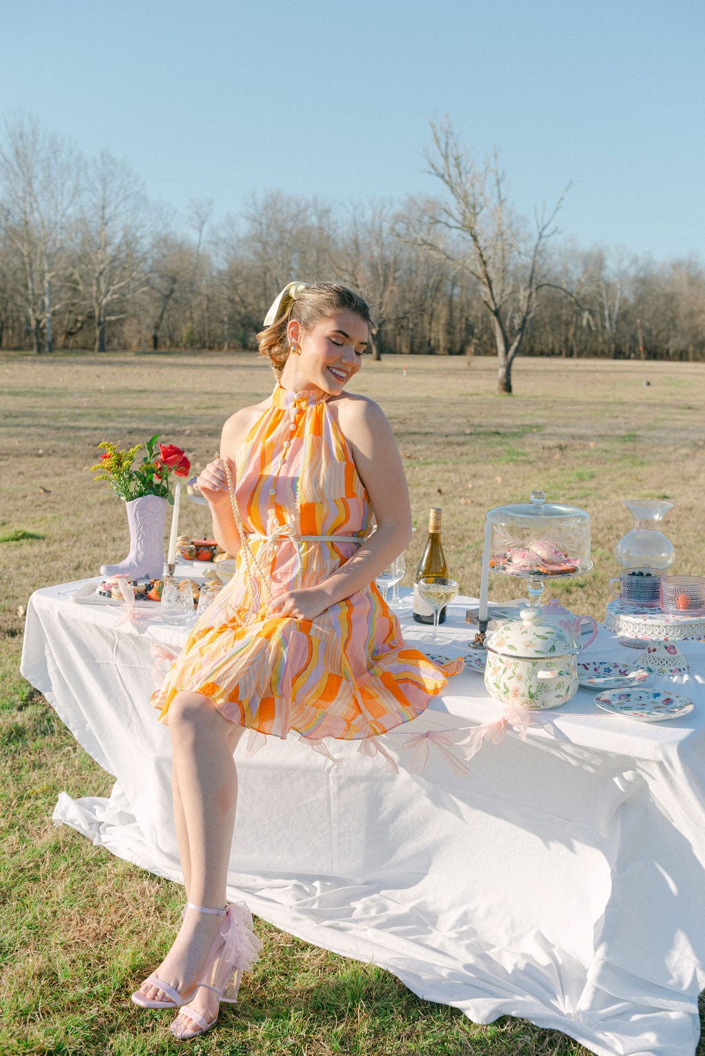 Elevate your wardrobe with our stunning Orange Tie Waist Halter Mini Dress! The halter neckline and sleeveless design create a feminine and chic look while the tie waist detail brings a touch of elegance. Multicolored, flowy, and light weight, this dress is perfect for any occasion. Complete with a button back closure for a secure fit.
