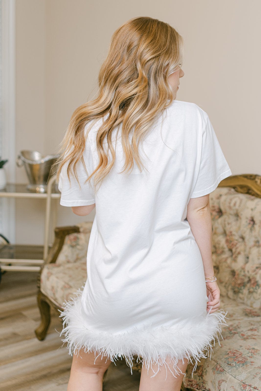 Indulge in a touch of elegance with our White Feather Hem T-Shirt Dress. The round neckline and short sleeves flatter any figure, while the stretchy fabric ensures a comfortable fit. And let's not forget the feather hem, adding a unique and feminine touch. True to size, this dress is a must-have for any fashion-forward bride.