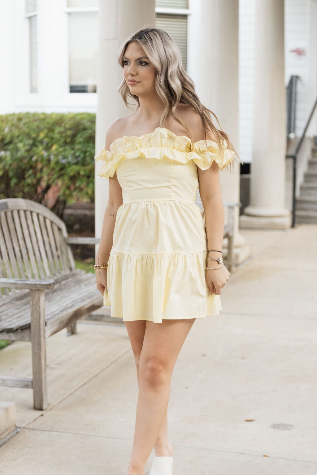 Transform into a sun-kissed goddess with our Yellow Ruffle Off The Shoulder Dress. The vibrant yellow hue and flirty ruffle details will make heads turn wherever you go. Designed with a stretchy and flowy fabric, this mini dress is perfect for any occasion, from dressy events to casual Spring outings. Dress up or down and radiate confidence!