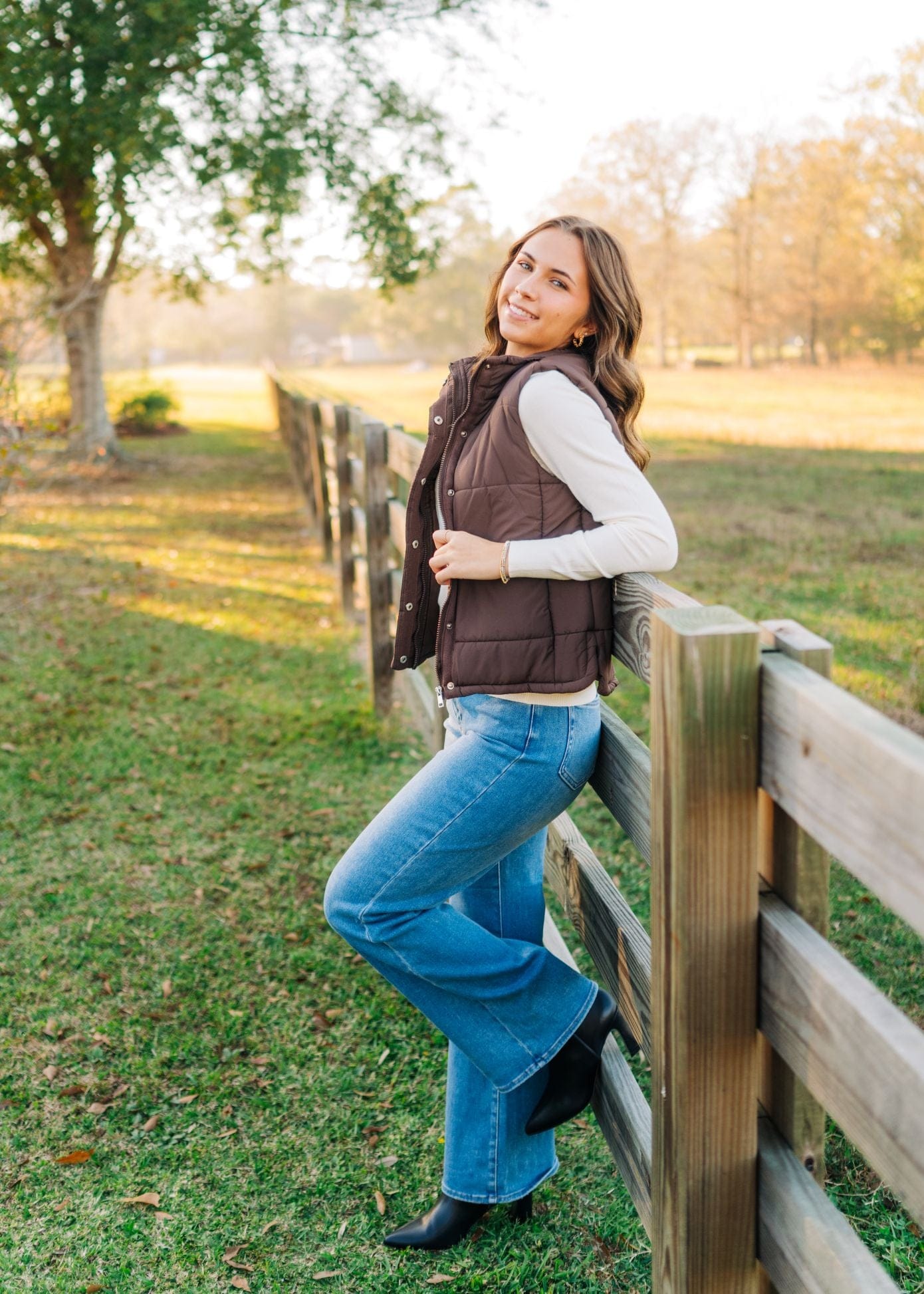 Layer up with effortless style in this brown quilted puffer vest. The sleeveless silhouette pairs seamlessly over any outfit, while the button-up and zip-up closures give you versatile styling options. Lightweight yet warm, this vest delivers cozy insulation without the bulk, making it perfect for transitional weather or as a chic layering piece year-round.