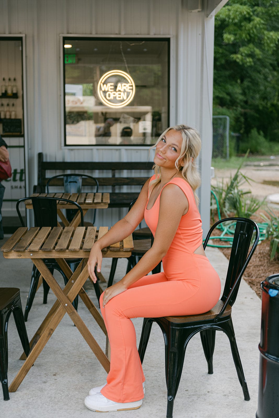 This cherished super soft, poly/spandex blend Venice fabric now in a chic and trendy active jumpsuit. With 4-way stretch and a lightly peached outer, this jumpsuit features a full built-in bra with removable pads, thick supportive straps, a flared leg silhouette , and a stylish twist detail with a center back cutout.