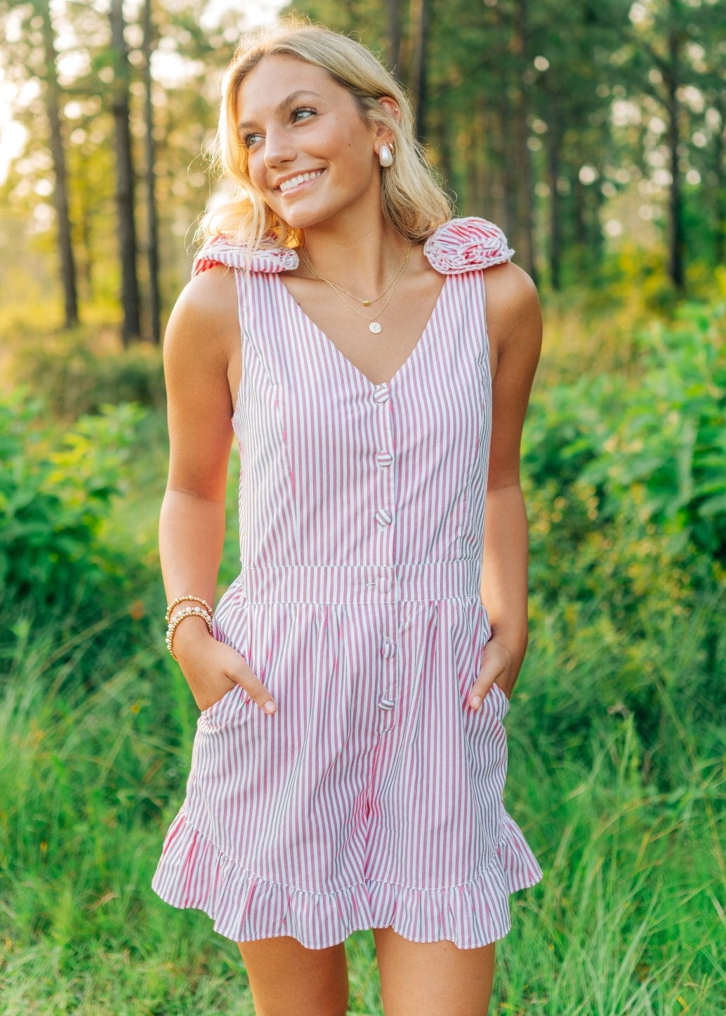 Celebrate in style with our Red Striped Rose Detail Romper. This sleeveless romper features a button up front, ruffle hem, and a playful rose strap detail. Perfect for 4th of July festivities or any summer event!
