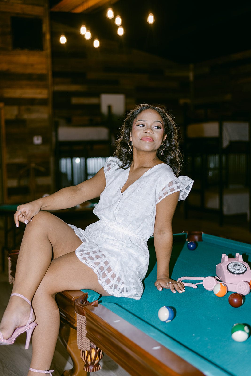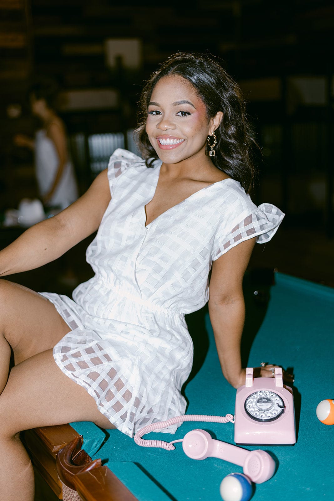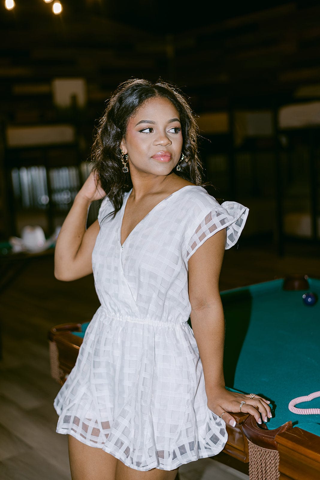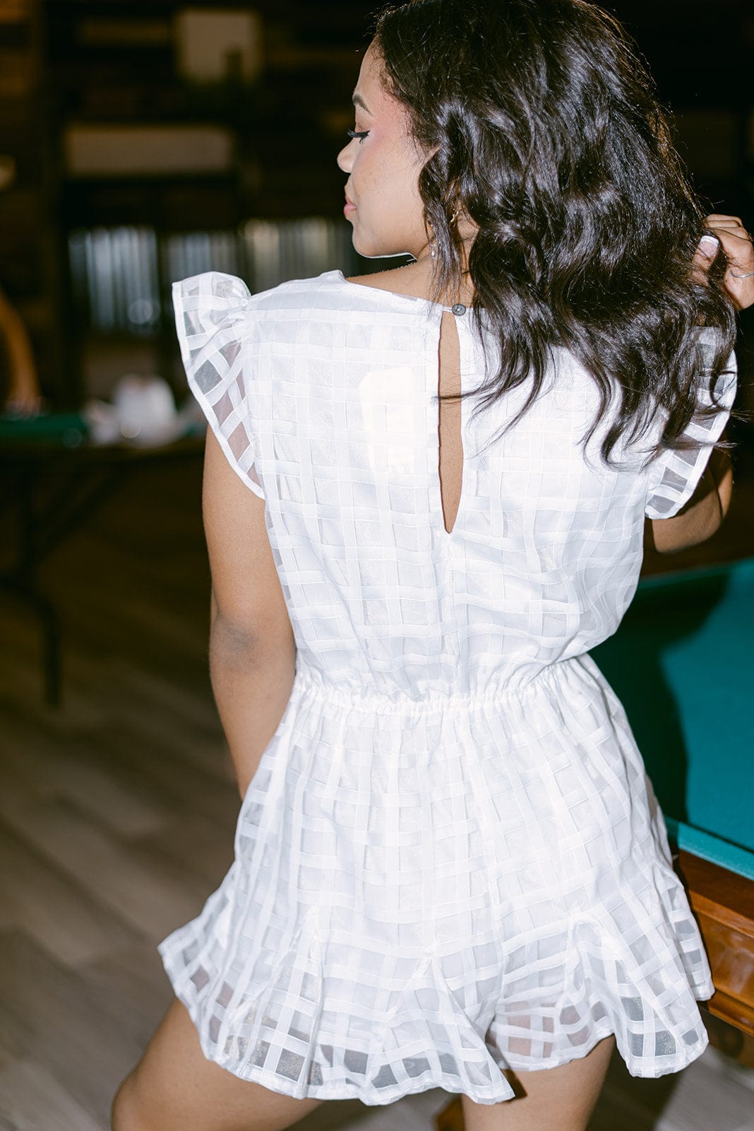 Fall in love with the White Mesh Checker Romper! Its v-neckline and ruffle flutter sleeves create a flattering, feminine look. The exquisite checked mesh detail adds a touch of elegance, while ruffle details add a playful touch. Perfect for a summer wedding shower or special event.