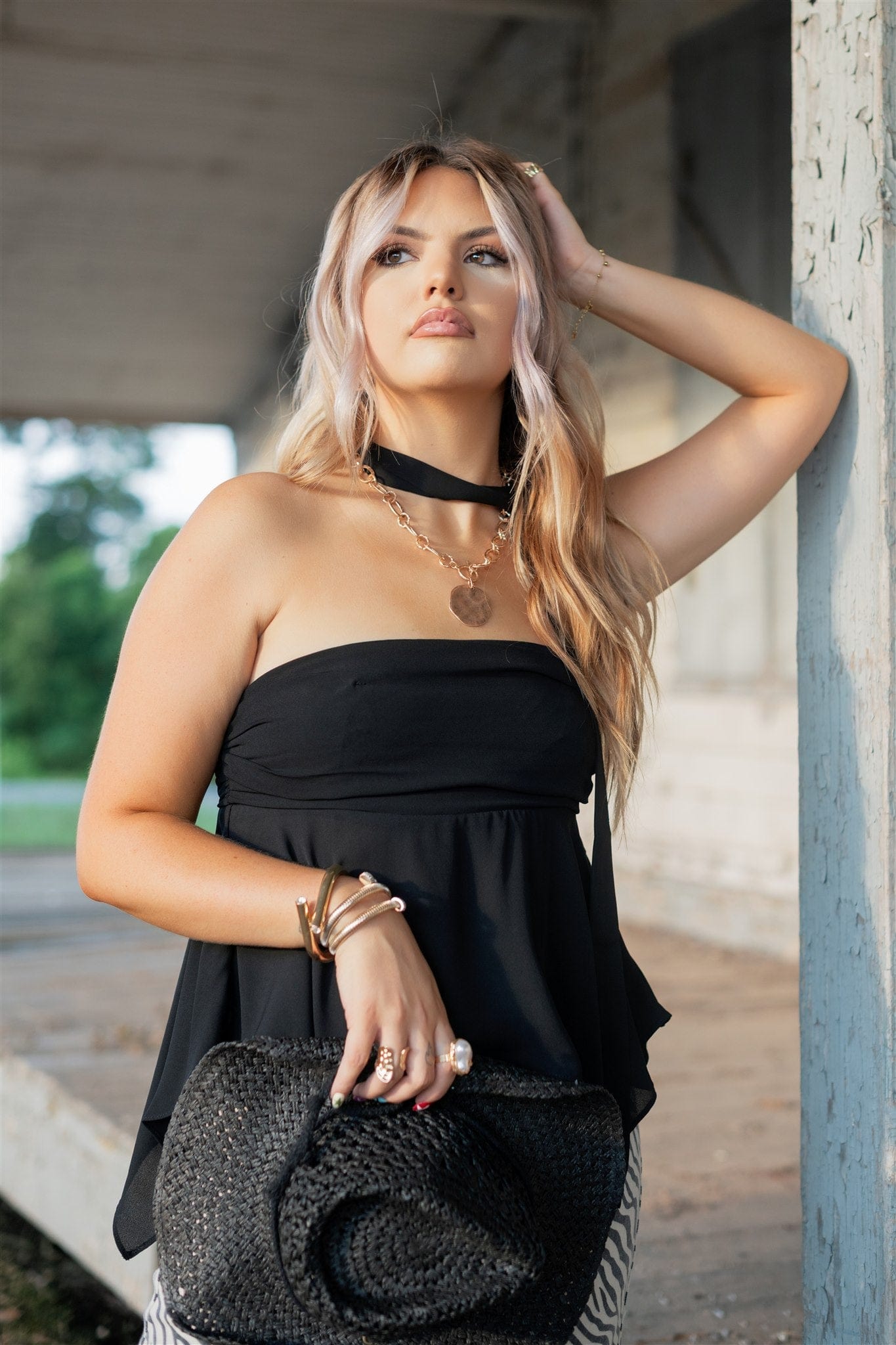 This black strapless blouse blends elegance with a touch of romance, featuring a delicate scarf detail that adds a unique flair. Its sheer, lined fabric ensures comfort and sophistication, while the hook & eye button-up back closure offers a secure and flattering fit. Perfect for fall transitions, this blouse effortlessly elevates your wardrobe with its chic, versatile style.
