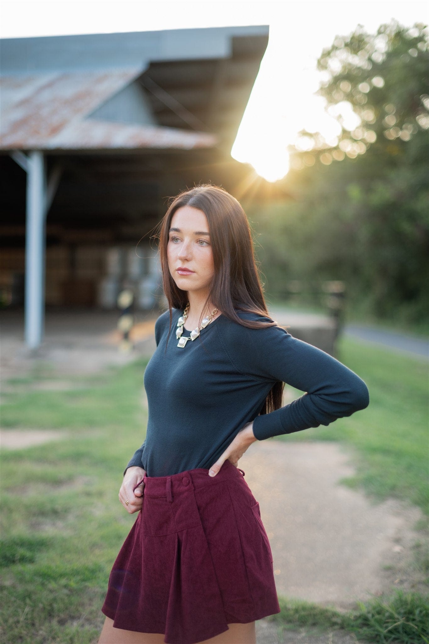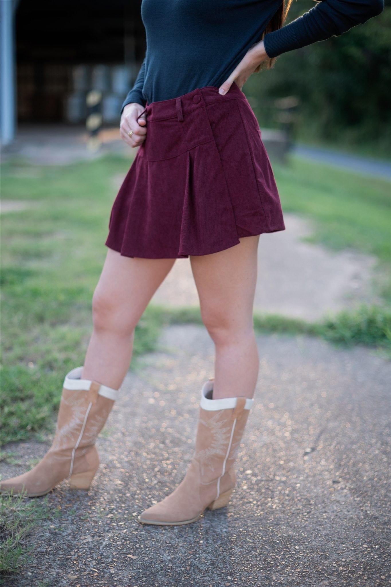 Elevate your fall wardrobe with this burgundy corduroy pleated mini skort. Its high-waisted design flatters your silhouette while the soft corduroy fabric adds cozy texture perfect for cooler days. The playful pleats bring movement and style, making it an ideal choice for both casual outings and chic layering. Embrace autumn in a versatile piece that combines comfort and trend effortlessly.