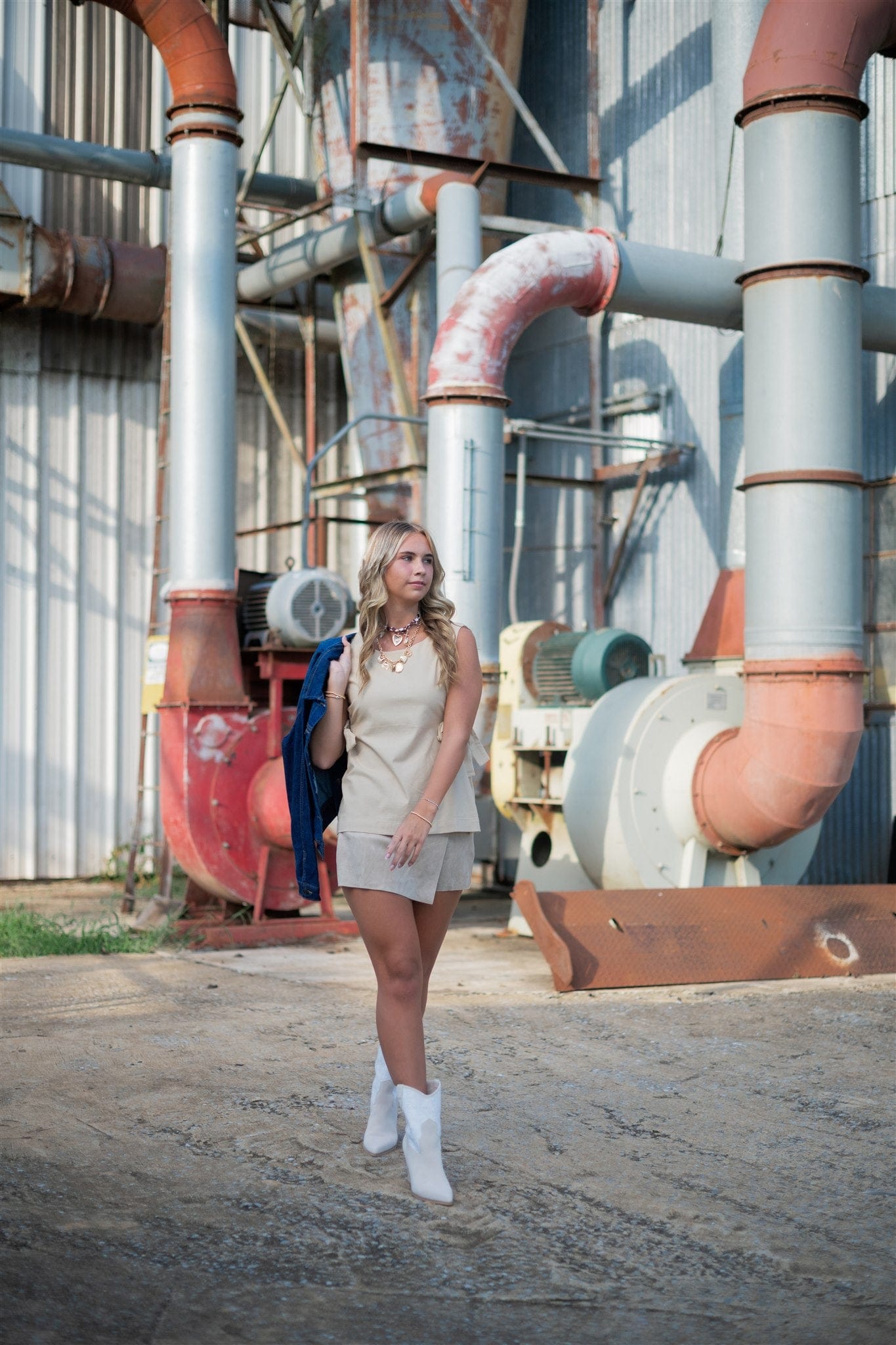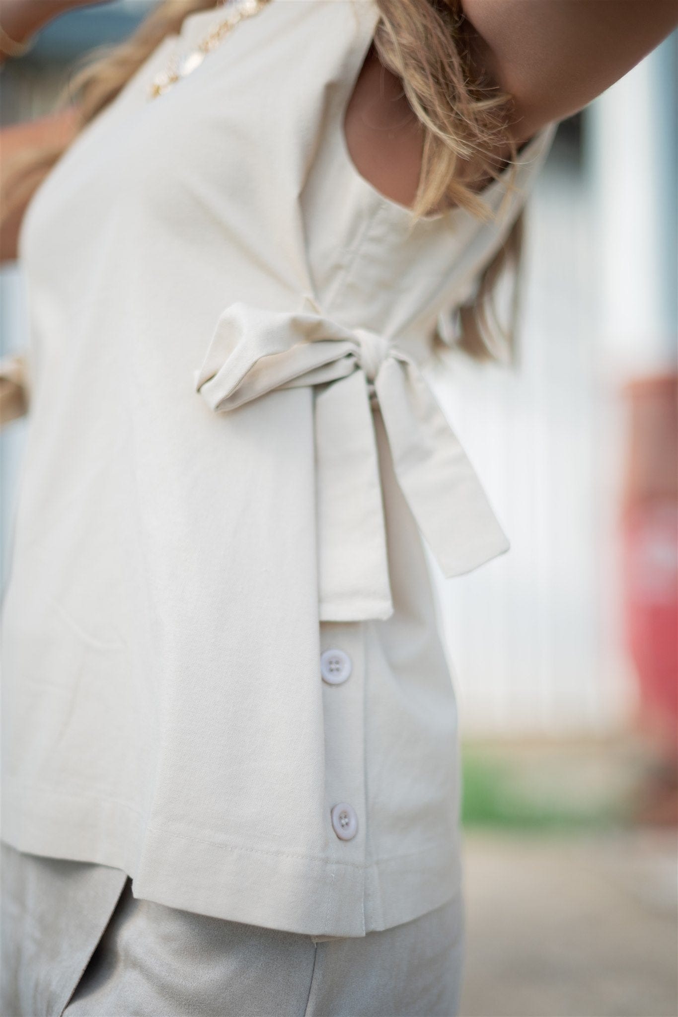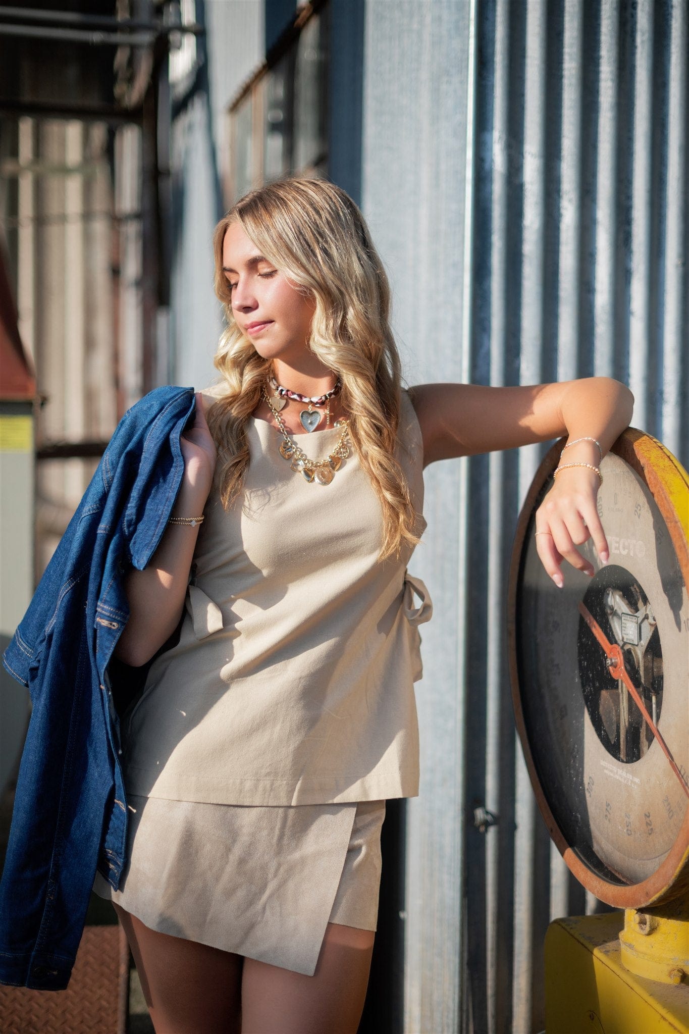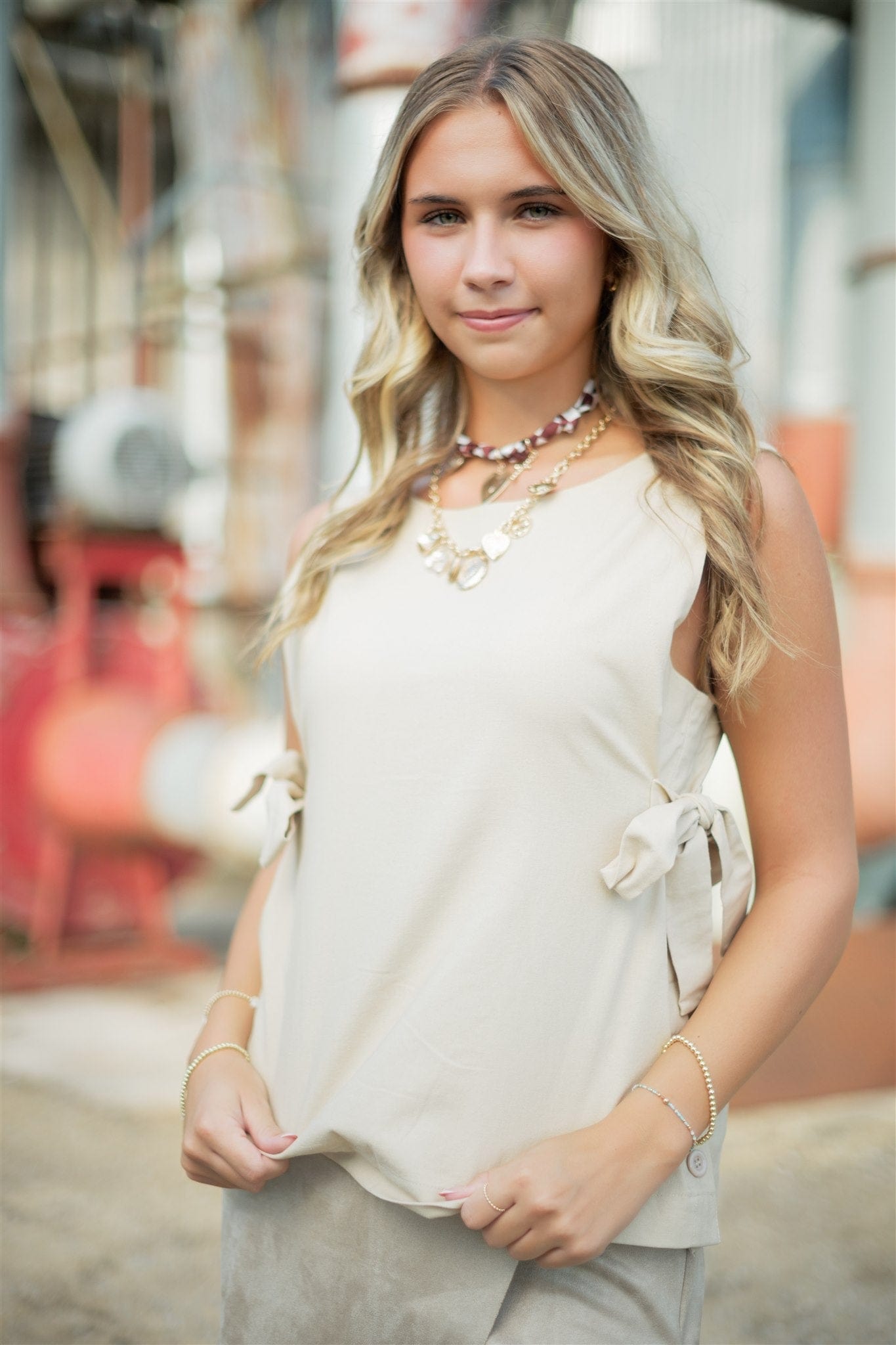 This Oatmeal Sleeveless Side Tie Top is perfect for your fall transition wardrobe. Its rounded neckline and sleeveless design keep you comfortable, while the side tie detail adds a flattering, adjustable fit. The flowy fabric ensures ease of movement, making it an effortlessly stylish choice as the seasons change.
