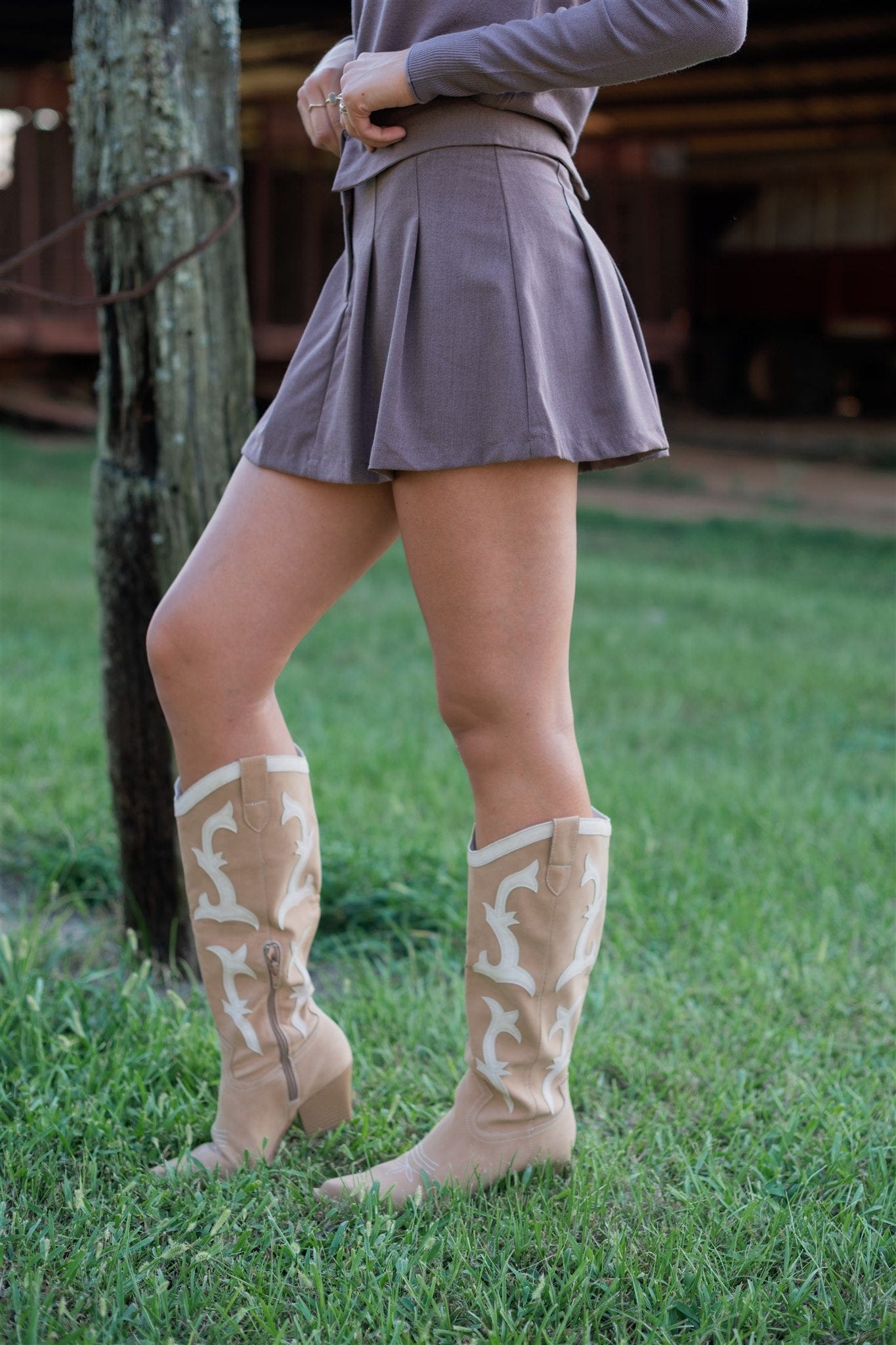 Introducing our Pecan Pleated Tailored Mini Skort, perfect for Fall! The high waisted design and flowy pleats provide a flattering fit, while the fold over waist adds a stylish touch. Made with soft and durable pecan-colored fabric, this mini skort is both fashionable and functional. Elevate your Fall wardrobe with this must-have piece!