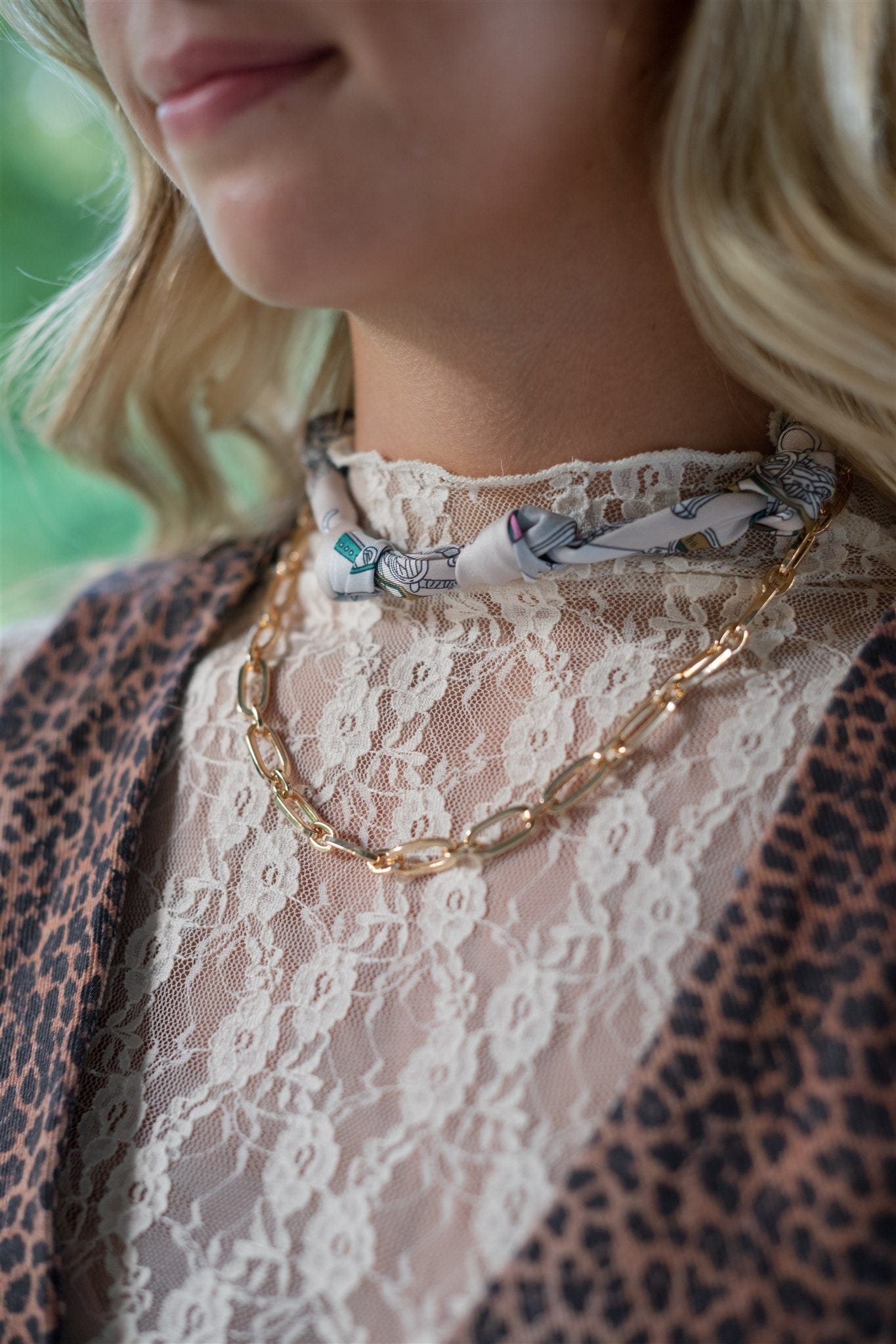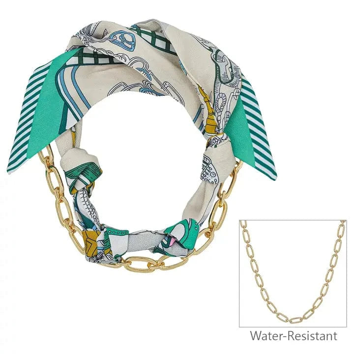 We present to you our Cream and Turquoise Knotted Scarf Necklace with Gold Chain. This multi-function accessory is more than just a scarf. Its removable gold chain allows you to style it in numerous ways, making it a versatile addition to your wardrobe. Add a touch of style and color to your outfit with this affordable yet fashionable accessory.
