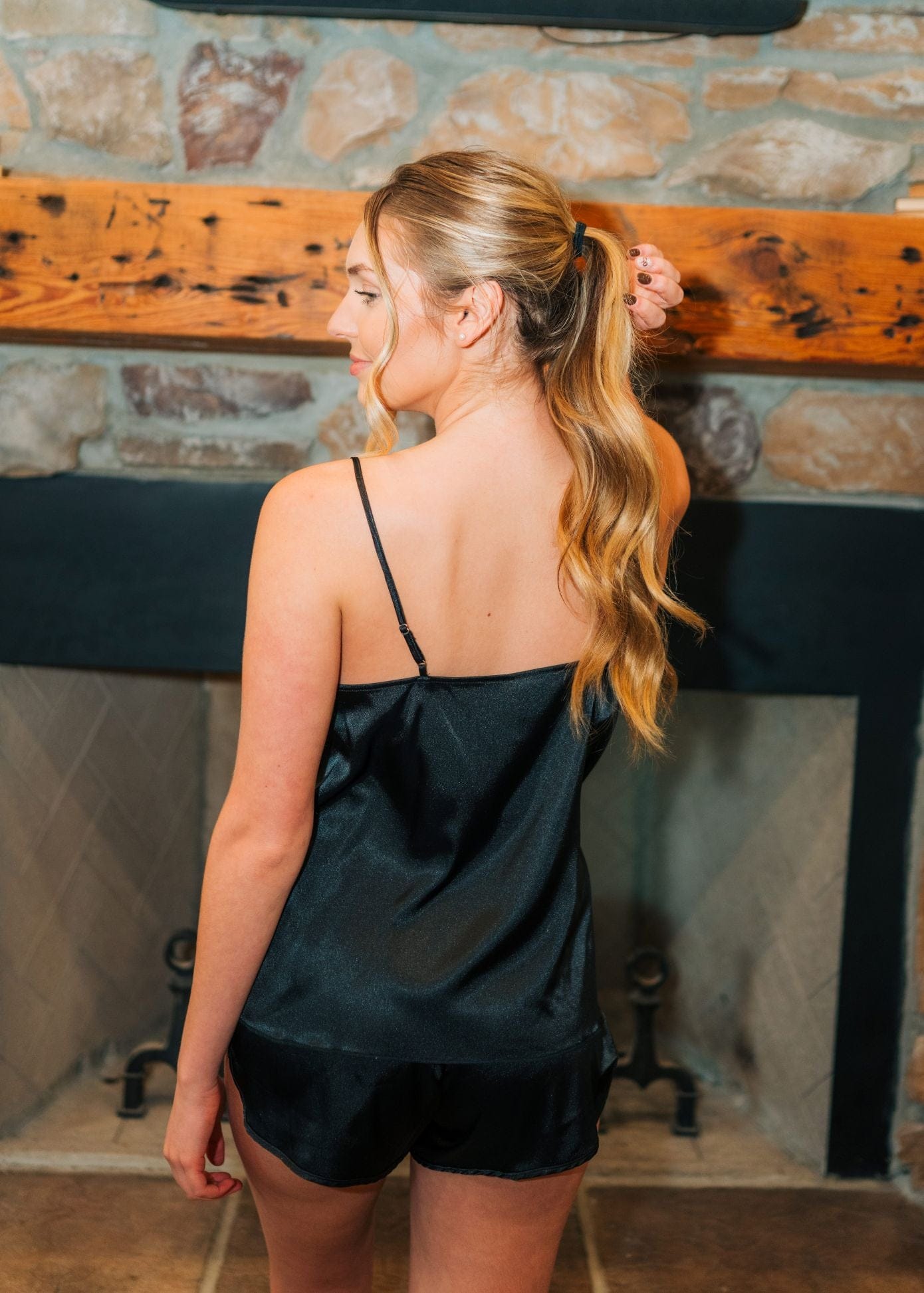 Slip into effortless elegance with this Black Satin PJ Short Set. Crafted from luxurious satin, the flattering V-neckline and delicate spaghetti straps create a refined silhouette, while the elastic waist ensures all-day comfort. The flowy shorts provide breathable ease for restful nights and lazy mornings alike. Perfect for those who refuse to compromise on style, even in their sleepwear.