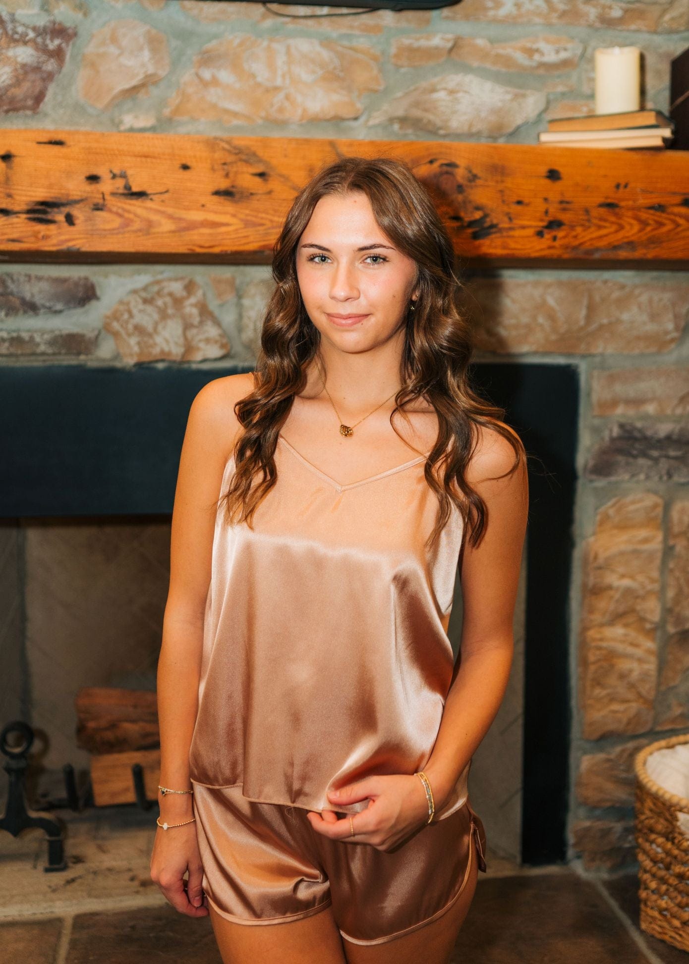 Slip into luxury with this gold satin pajama set designed for effortless elegance. Delicate spaghetti straps frame a flattering V-neckline while the flowy silhouette drapes beautifully against your skin. The elastic waist ensures a comfortable, adjustable fit that moves with you throughout the night. Crafted from silky satin, this set combines sophistication with everyday comfort—perfect for winding down in style or lounging at home.