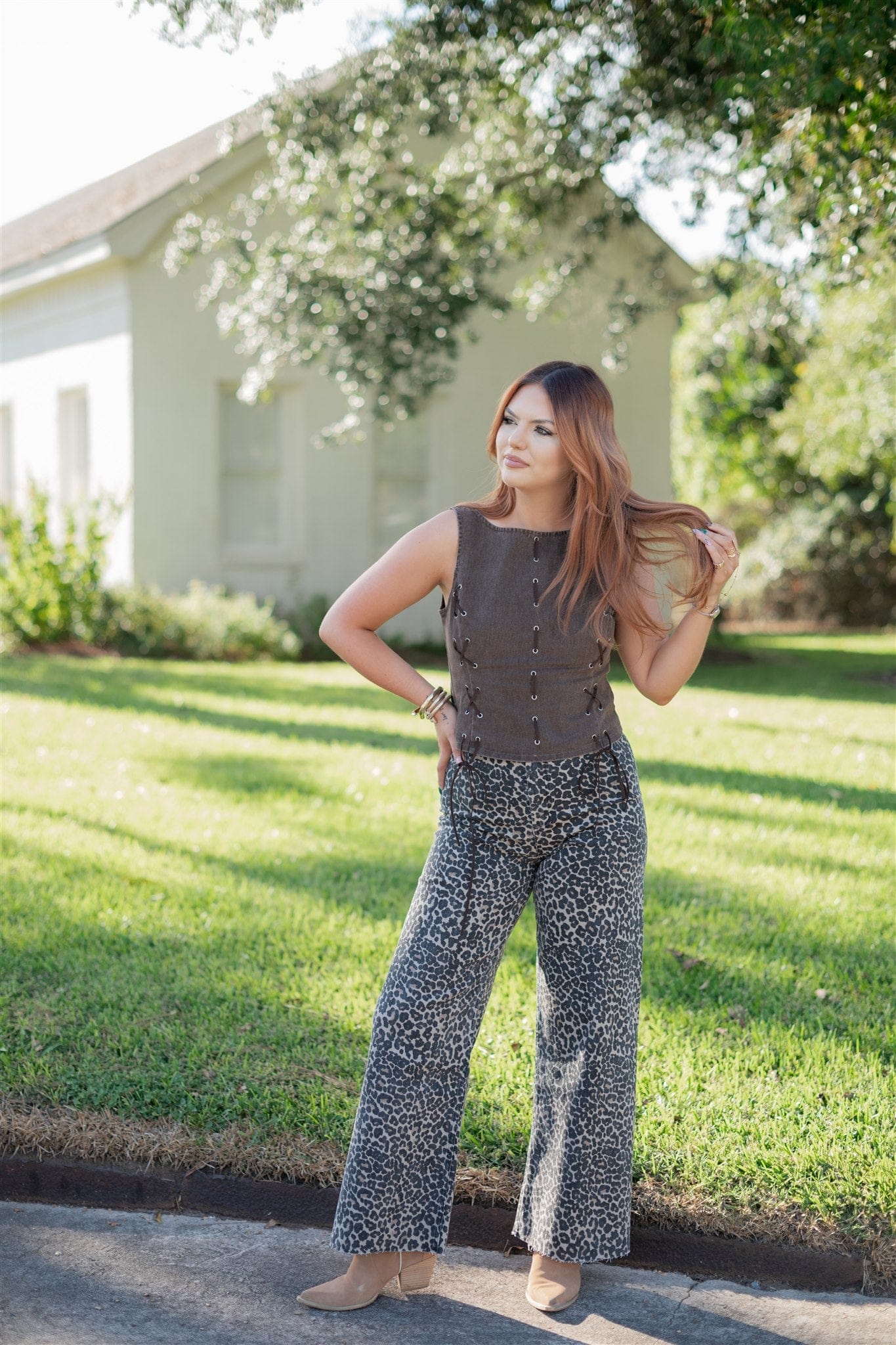 Embrace the season with this brown denim top featuring a chic boat neckline and intricate eyelet details for a subtle touch of elegance. Its sleeveless design offers versatile styling options, while the convenient zip-up back closure ensures a perfect fit. This trendy piece is ideal for layering or wearing on its own, adding effortless style to your fall wardrobe.