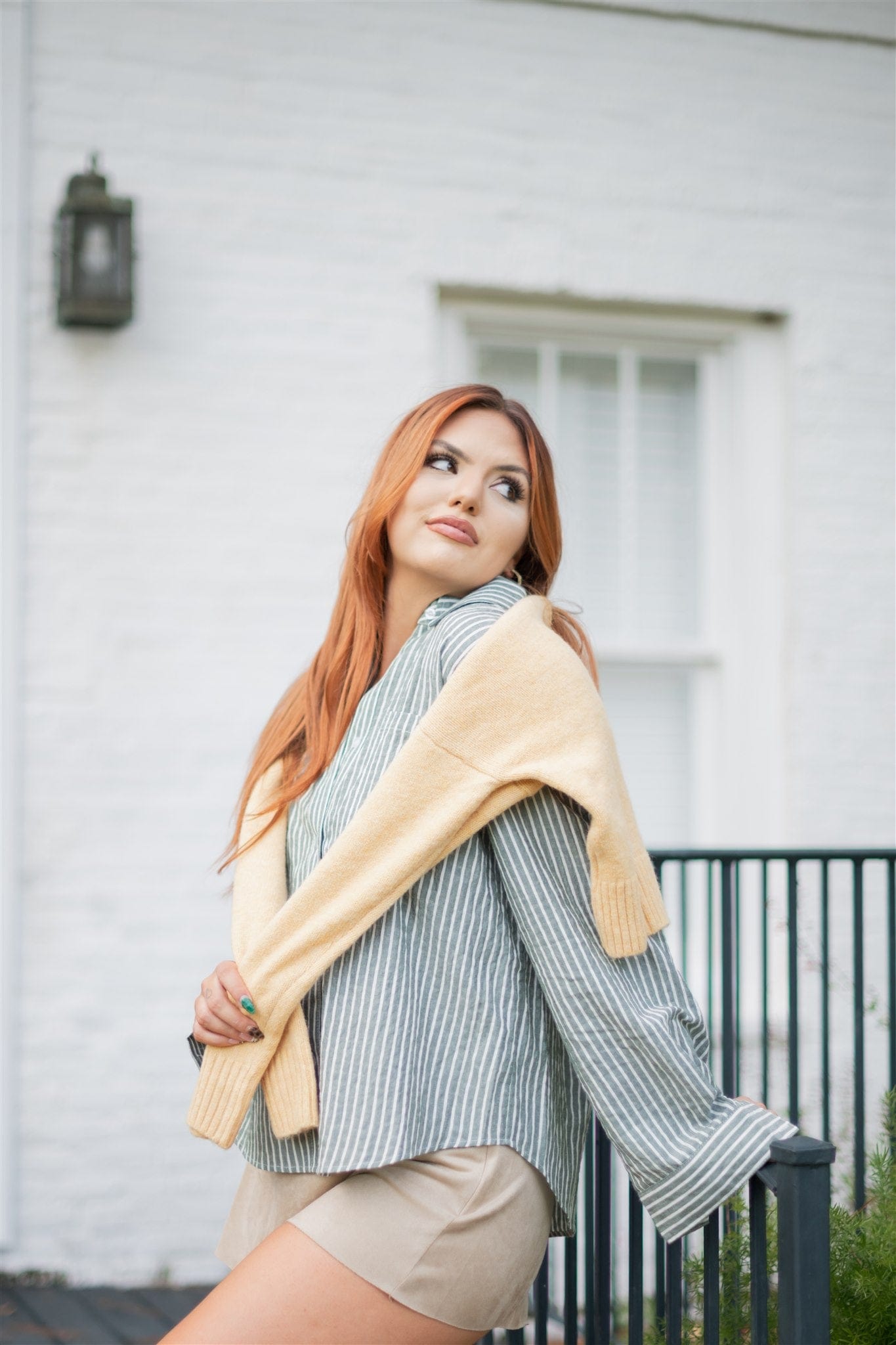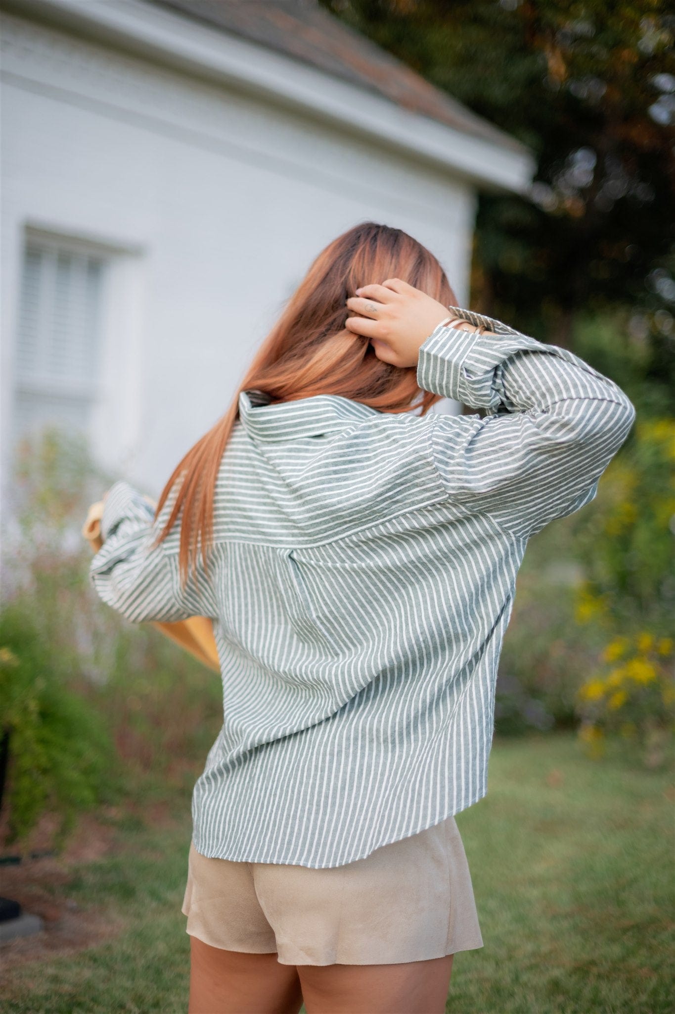 Crafted for the discerning wardrobe, this green striped button-up blouse features a refined collar and long sleeves, embodying a perfect balance between structure and ease. Its flowy, relaxed fit allows for seamless layering during the fall, offering both comfort and versatility. Ideal for elevating seasonal ensembles, this blouse pairs well with tailored pieces or casual layers, making it an expert addition to your collection.